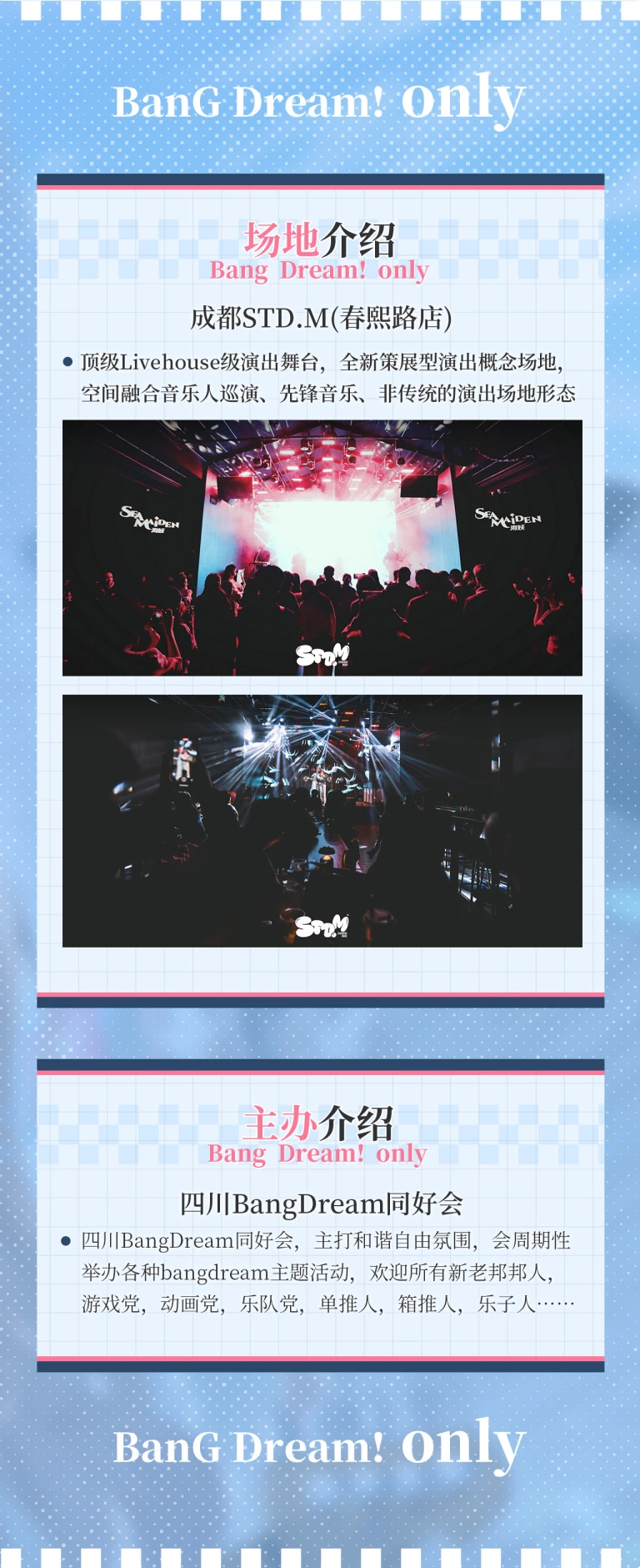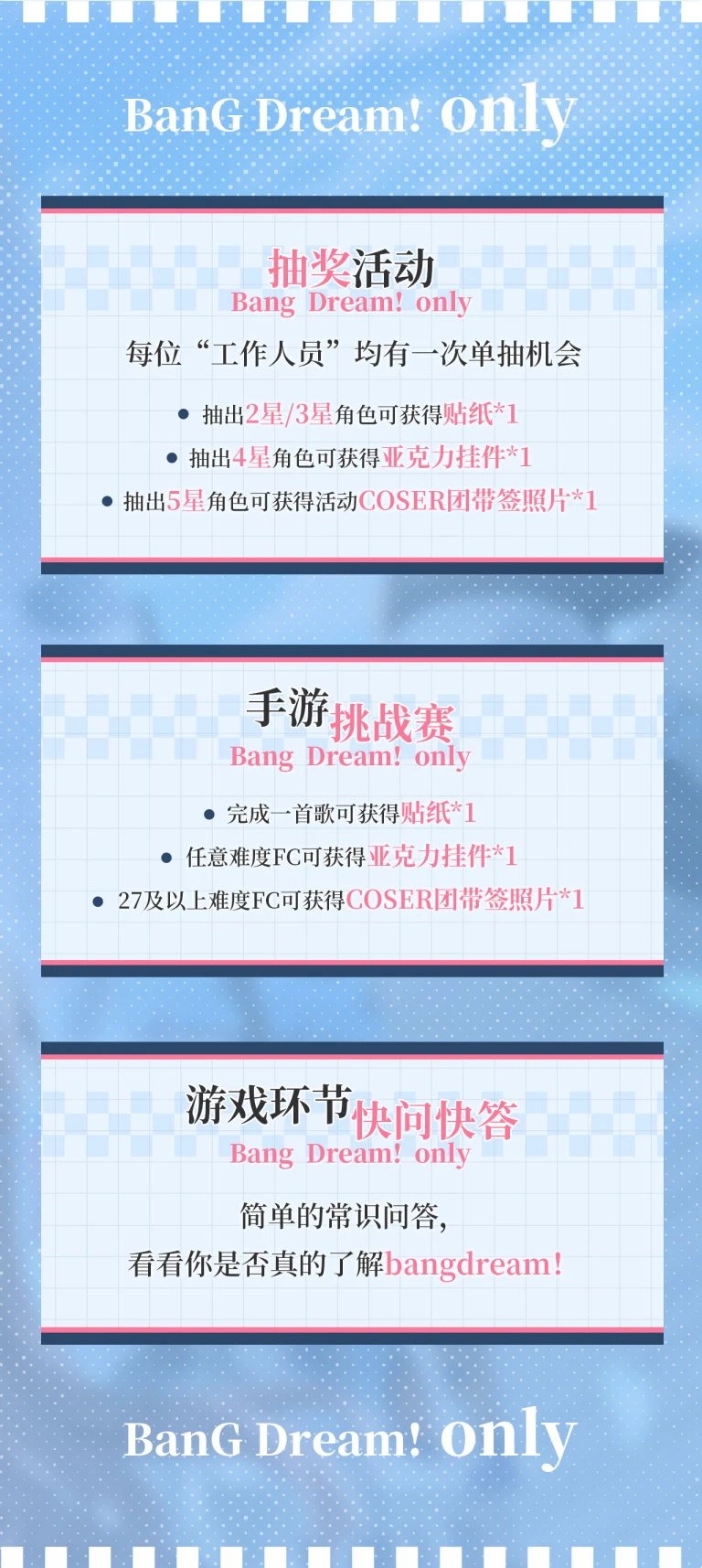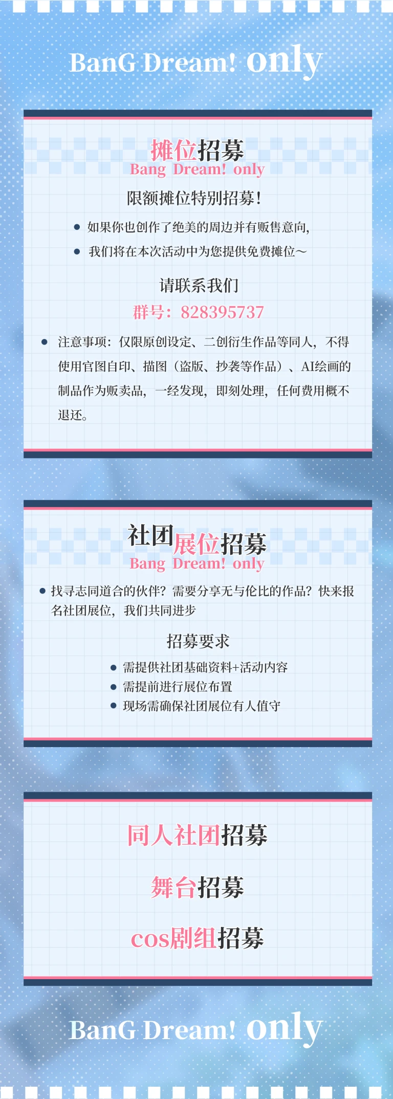 活动内容有同人摊位、乐队舞台演出、各类bangbang小游戏!
