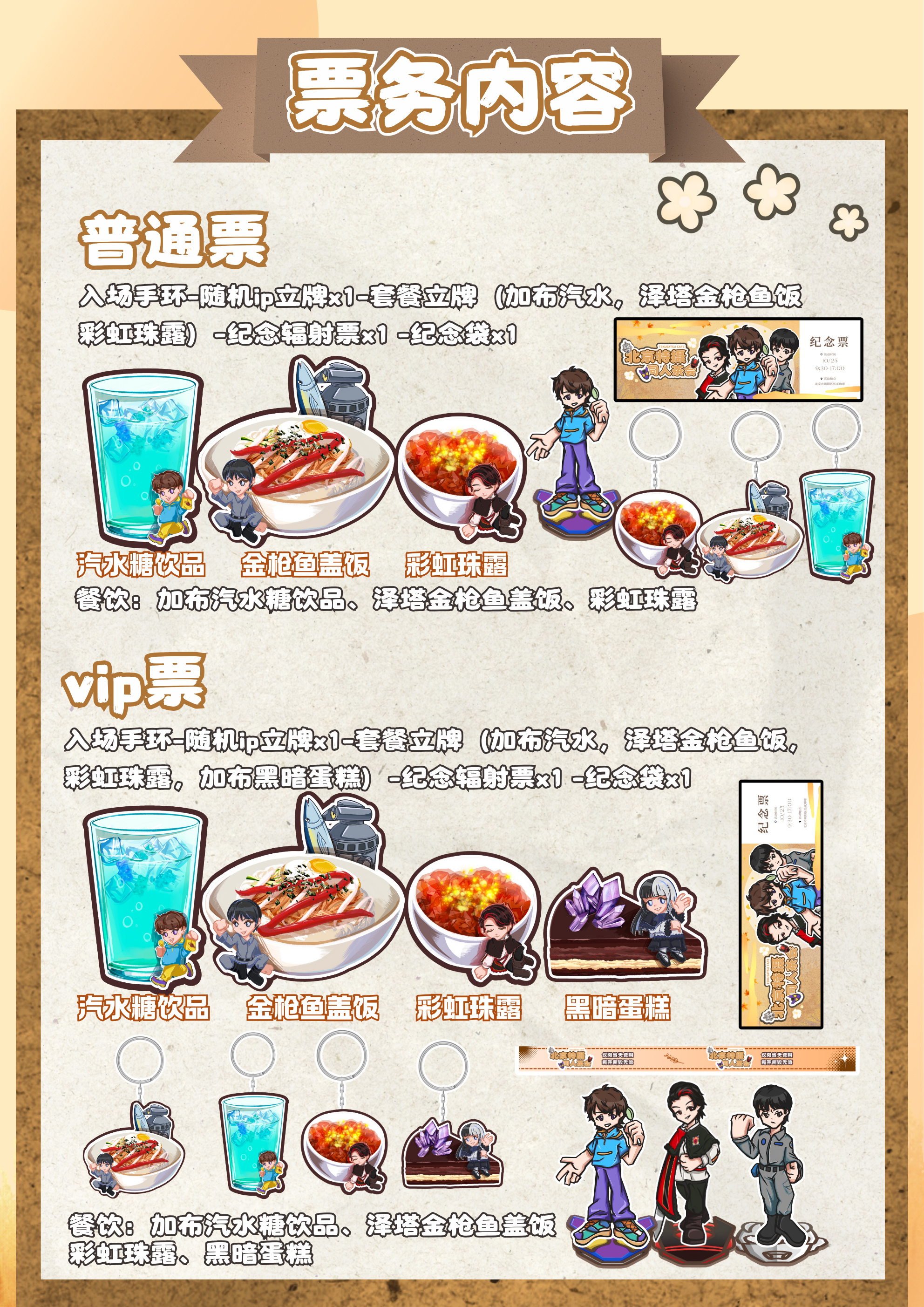 包含:入场手环-随机ip立牌,套餐立牌(加布汽水,泽塔金枪鱼饭,君王者露珠)-纪念辐射票