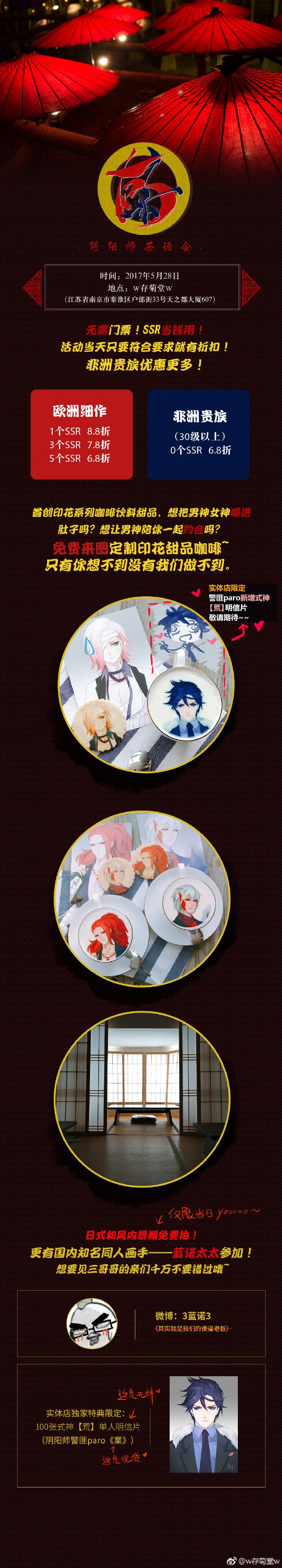 *主题:【阴阳师茶话会】 *时间:5月28日10:30-16:00 *地点:南京新街口天之都大厦607【w存菊堂w】咖啡甜品工作室 *福利:——【SSR优惠券】爸爸们手中的SSR就是优惠券哦!当然也可以来感受我们对非洲贵族的体♂贴和关♂怀! ——【和风影棚免费拍】阴阳师COSER当日可以免费来棚拍哦! ——另外我们英俊的老板@3蓝诺3 也会亲自参与并为大家准备了限定福利哦!~【当然老板也要出COS,猜猜老板这次出哪位式神呢】 ——关注@w存菊堂w 并艾特两位好友,转发此PO抽送两套存菊堂独家定制印花图案饼干哦!