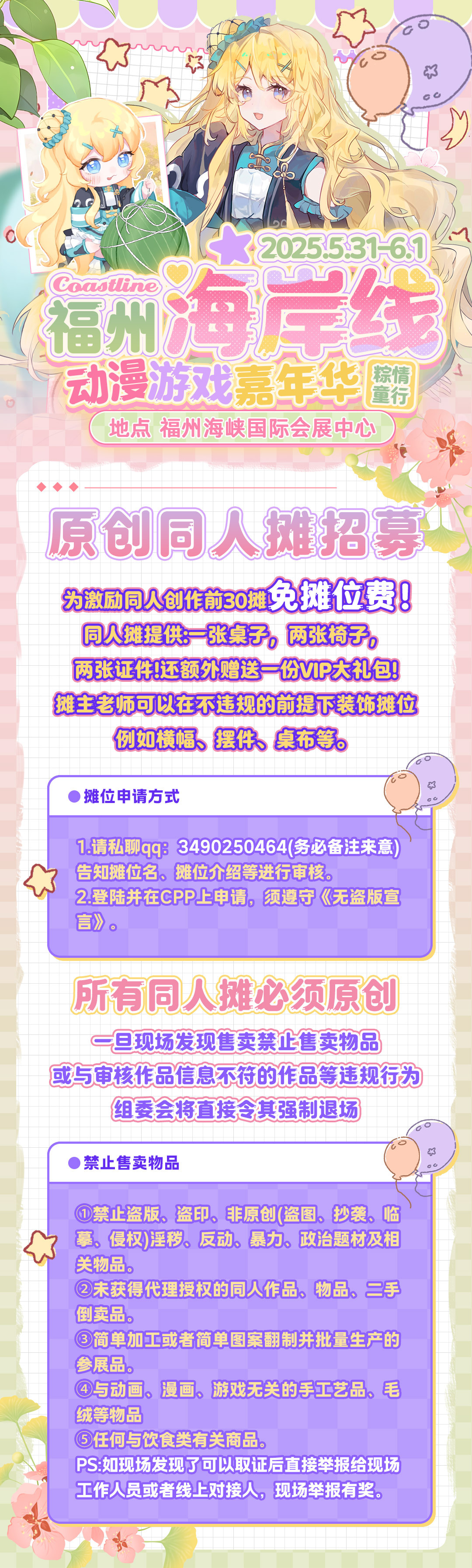 注:本次漫展上桌摊街区皆正版,禁止一切盗版产品,请各位摊主严格遵守规定,谢谢配合,摊主可自带摊位门牌(0.4m*1m)不得超出规定范围,活动期间请严格遵守相关规定,再次感谢。
