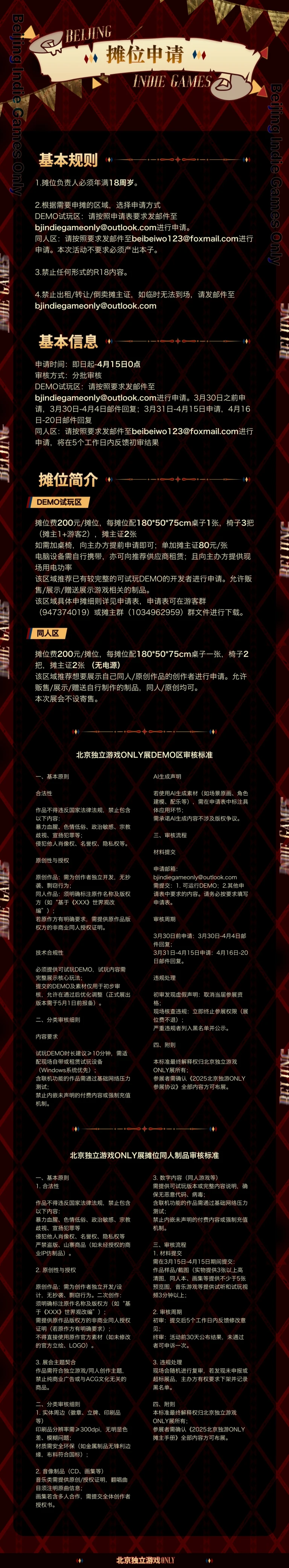 4.禁止出租/转让/倒卖摊主证,如临时无法到场,请发邮件至bjindiegameonly@outlook.com