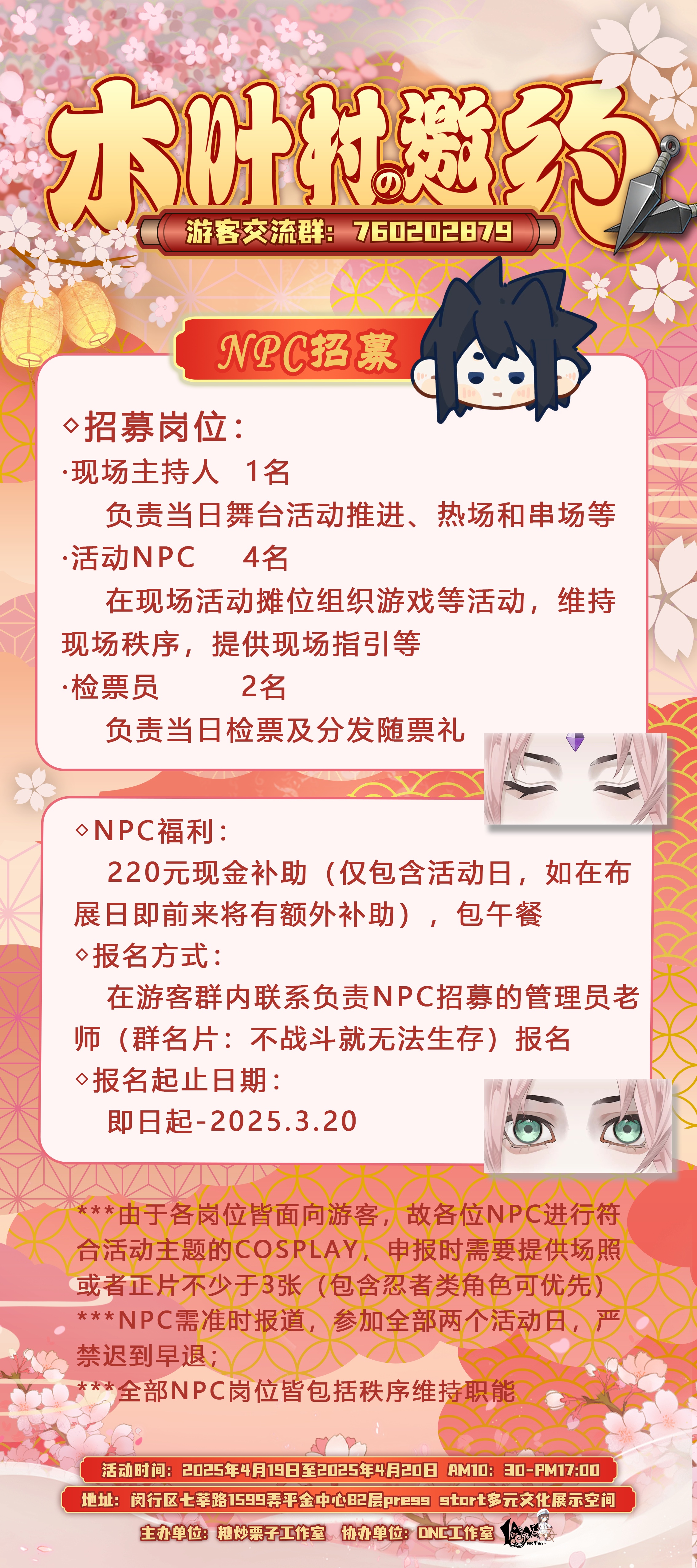 🔆禁止贩卖违背社会工序良俗、涉及敏感话题的IP制品;为避免不必要的争吵,本展会仅支持售卖日系acg作品中忍者相关内容的制品1、每摊需至少包含三个及以上不同的柄图;或四个以上的制品,制品要有较高的完成度和精细度2、支持特殊摊位申请,如占卜、游戏等互动形式。如需申请特殊摊位,请直接和申摊管理联系3、摊主需年满18岁,有足够的时间、经历及经济能力等支撑摊位的筹备4、制品须原创/已获得授权,禁止贩卖未经授权及涉及争议(抄袭、AI制图等)的制品。