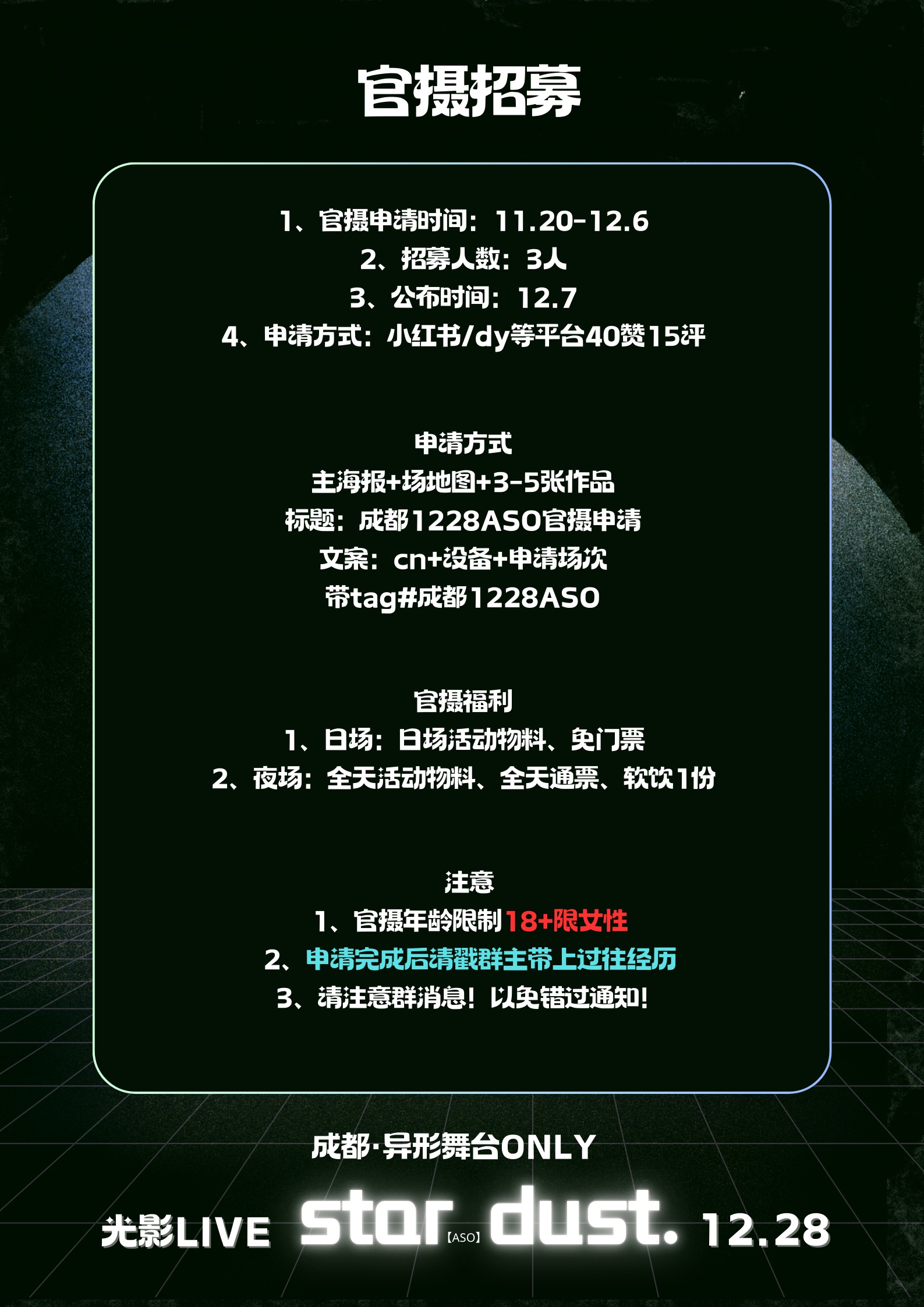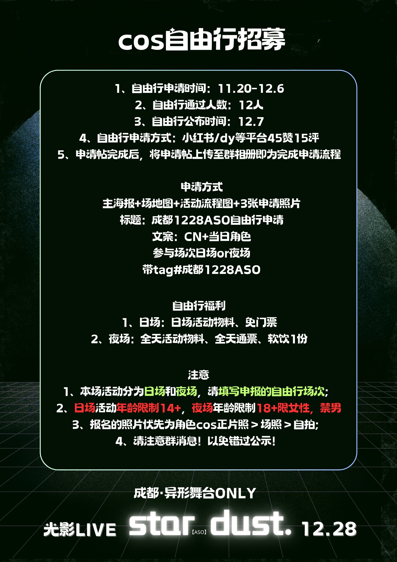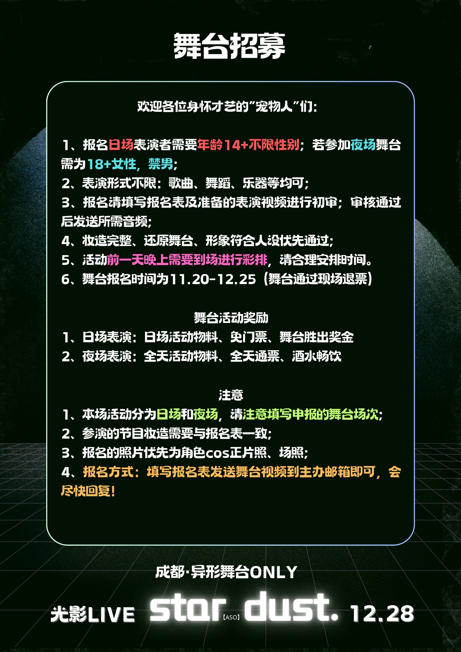 活动分为日常和夜场,现开放舞台、COS自由行、官摄招募,欢迎老师们报名~