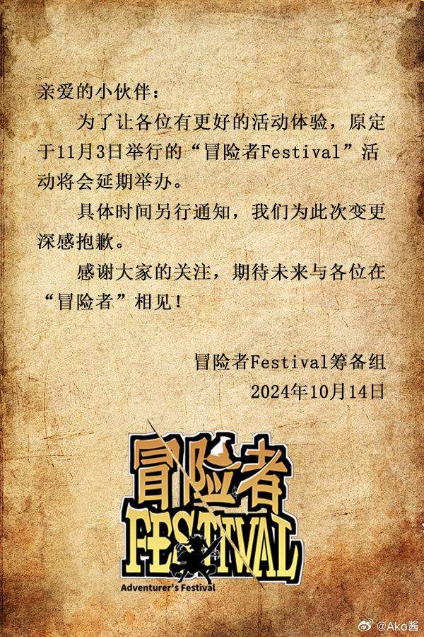 为了让各位有更好的活动体验,原定于11月3日举行的“冒险者Festival”活动将会延期举办。