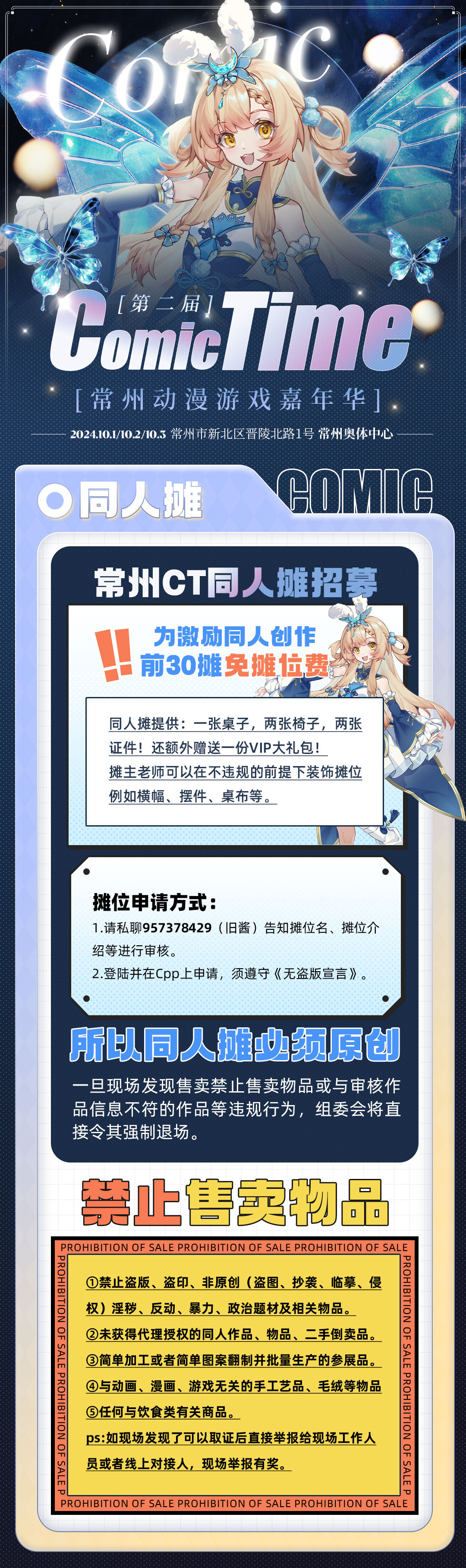 2:其余超出30个免费同人摊位的申请摊位:150一天,三天450,一摊两证、1.2m、三天必须都在,当天同人摊位每份物料样品给主办方,当天若有举报/发现有盗版非原创内容,当天直接退摊,费用直接扣除。