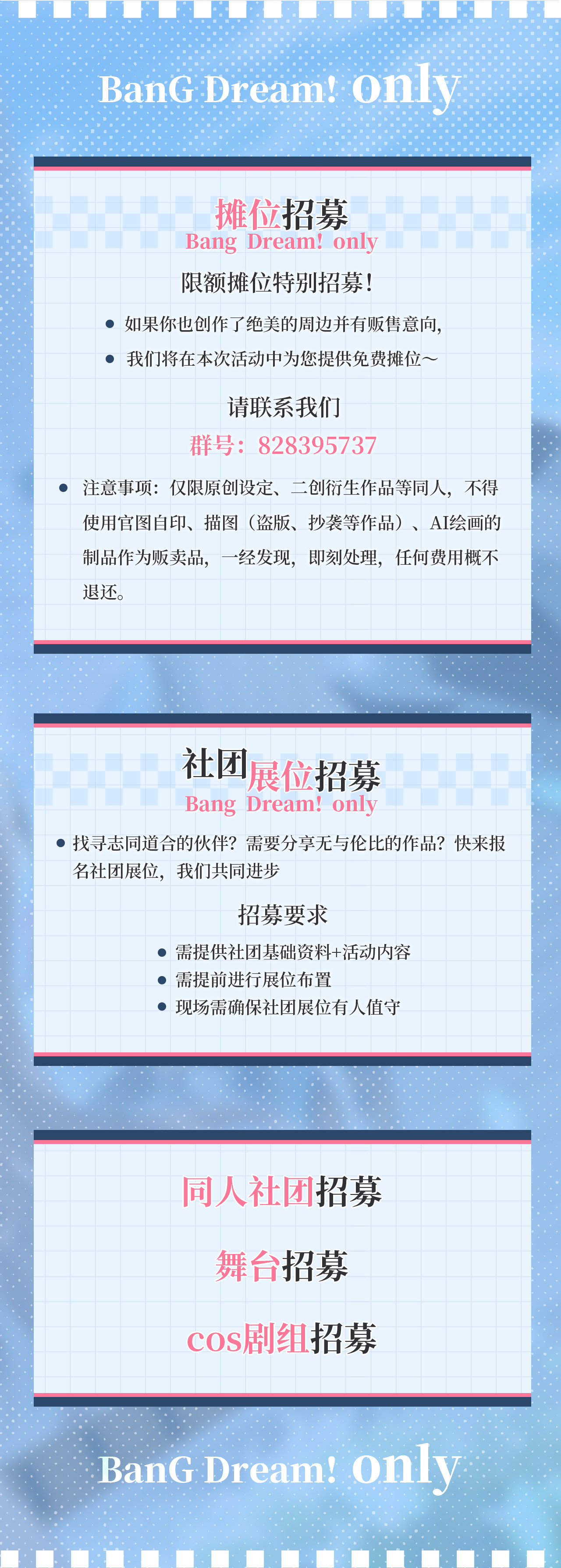 活动内容有同人摊位、乐队舞台演出、各类bangbang小游戏!