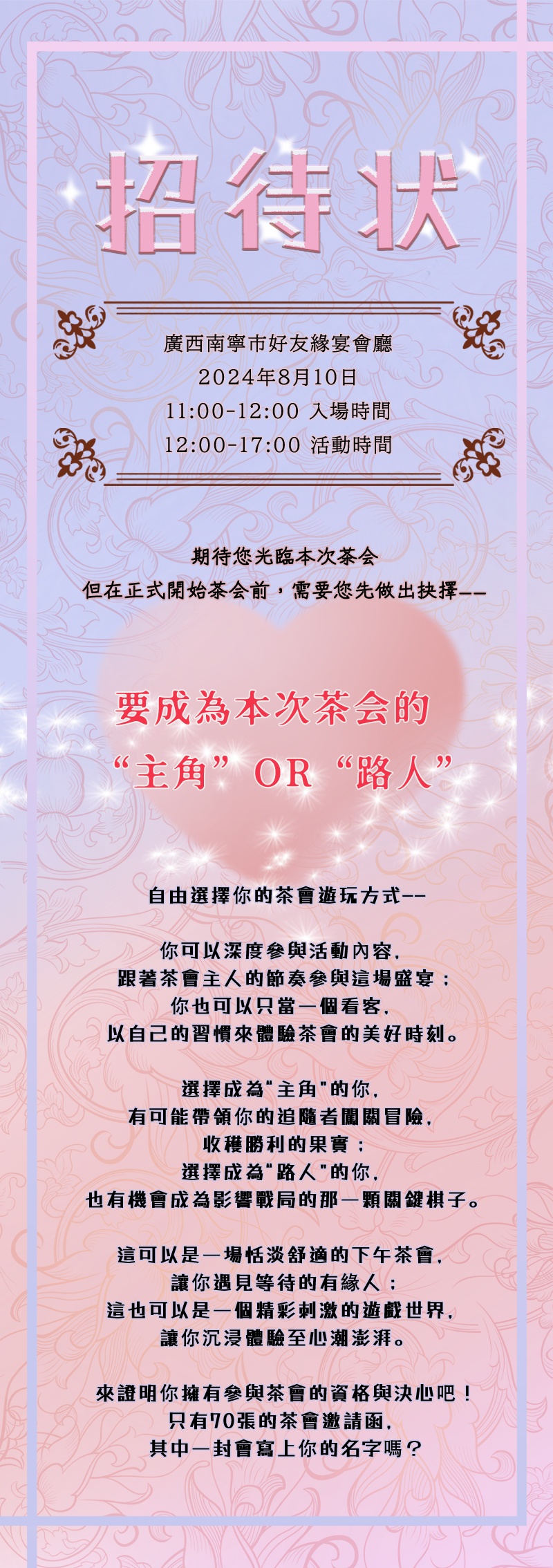 【重点2】本场活动的“游戏性”很强,适合愿意进行被动社交的朋友,当然孤狼玩家也能有所收获,但一定不适合社交目的性非常强的女明星。