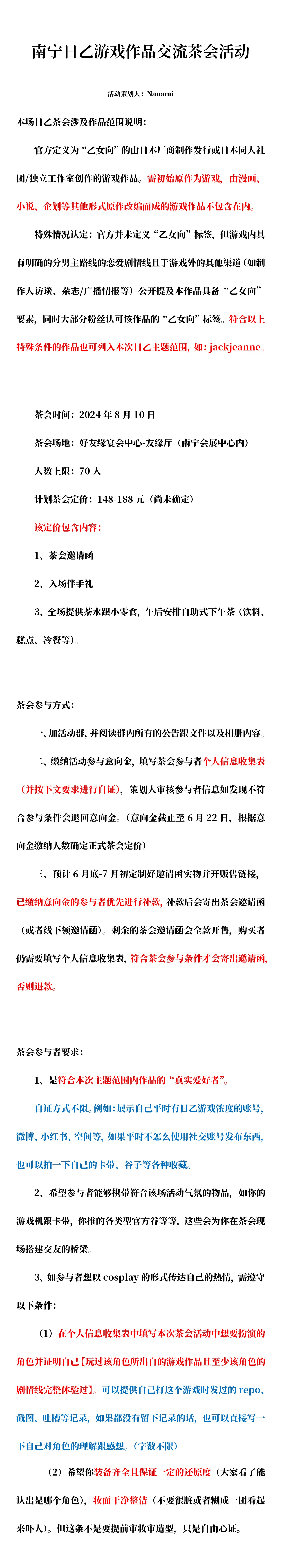 【重点1】这是主题交流茶会,不是Only展会,没有商业性质内容,由于场地方要求不能做盈利销售所以只支持无料制品进场!!!请大家注意!!!!如果各位老师有想要放到现场进行交换无料制品欢迎申请参与!!
