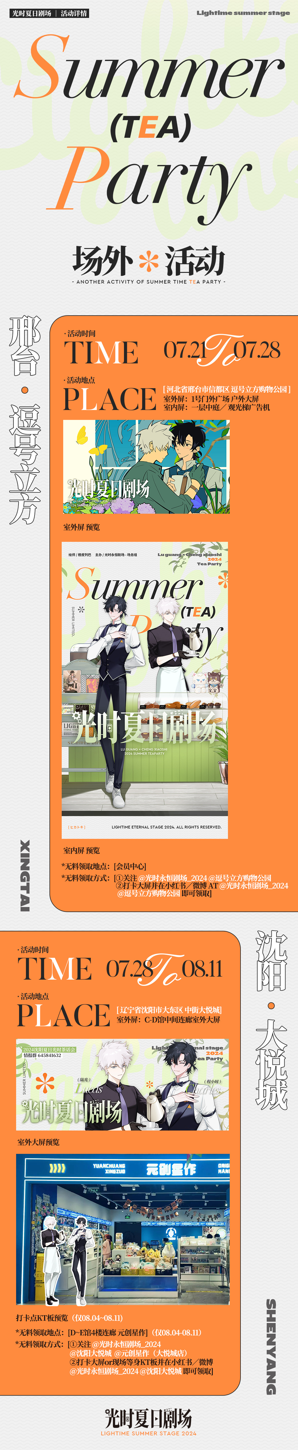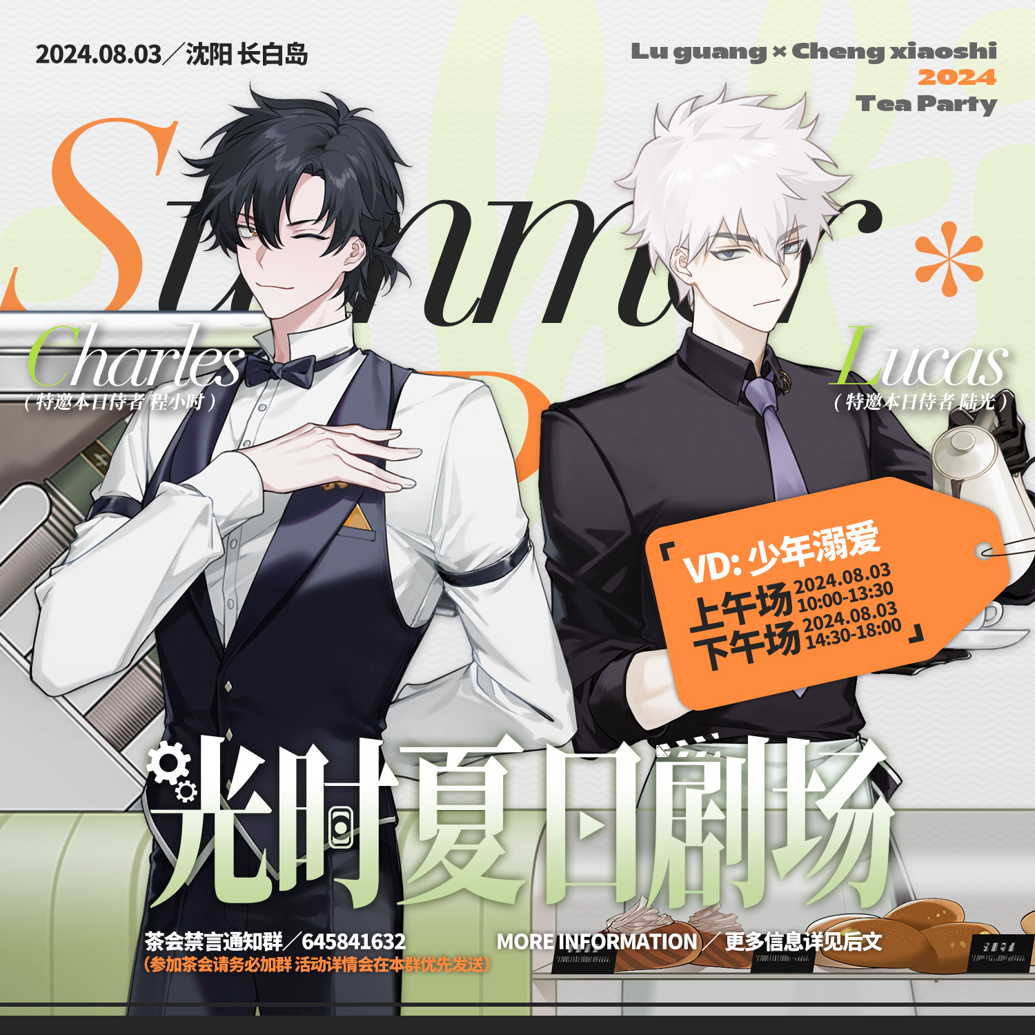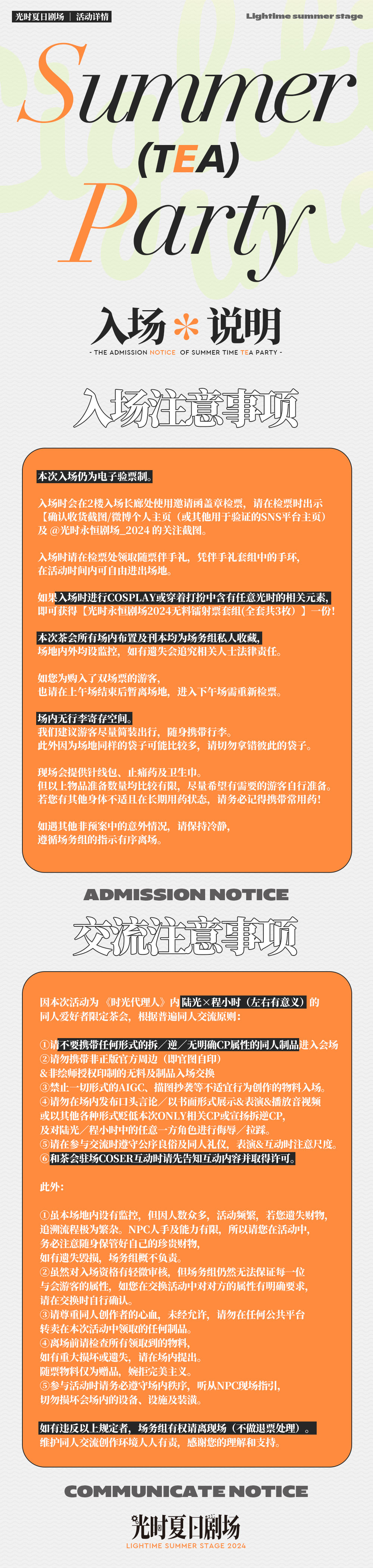 - 如您需Cosplay,本次Only仅限陆光/程小时二人的Cosplay入场。不接受任何《时光代理人》作品内其他角色及作品外任何虚拟角色的Cosplay。