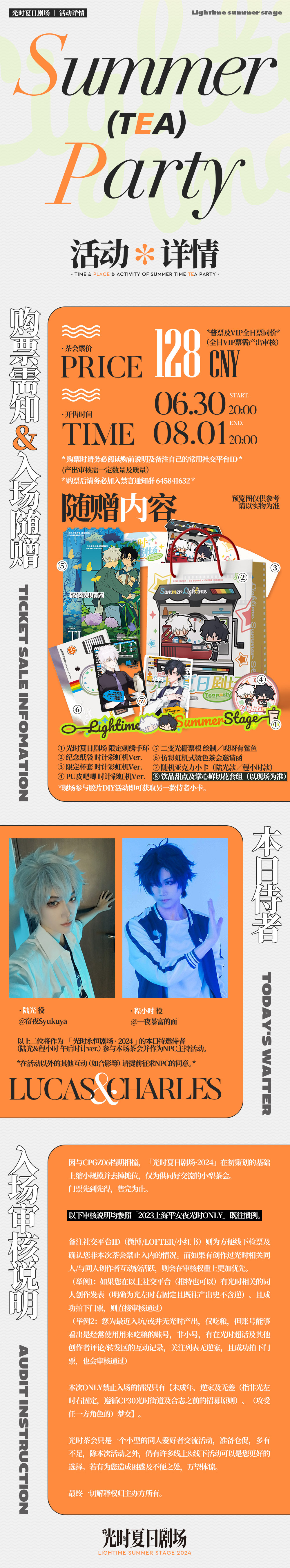 - 如果入场时进行Cosplay或穿着打扮中含有任意陆光×程小时的相关元素,即可获得【光时永恒剧场2024无料镭射票套组(全套共3枚)】一份!