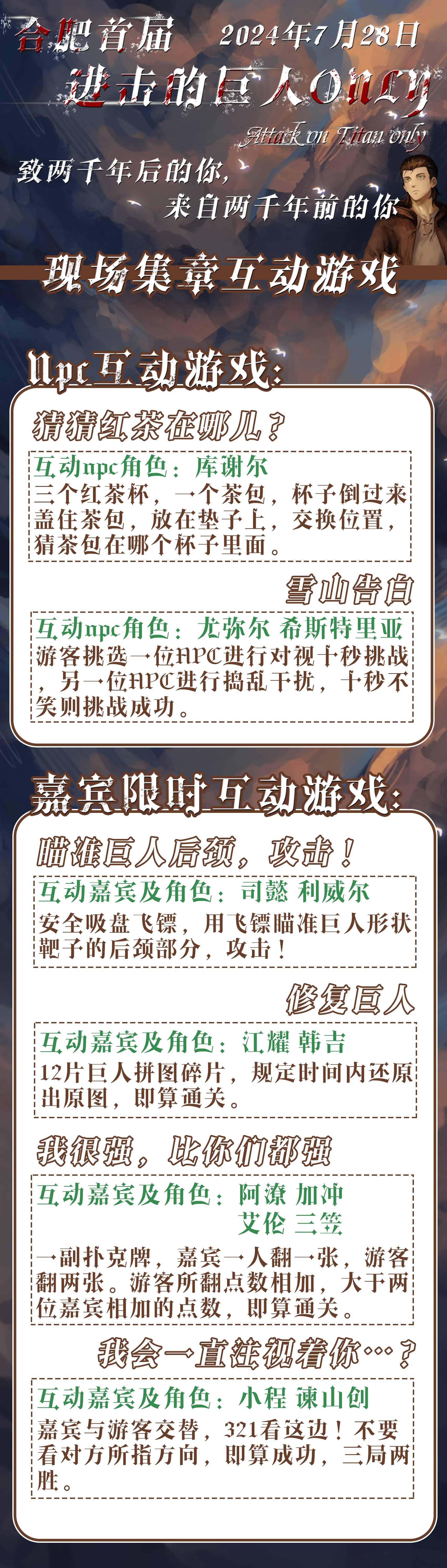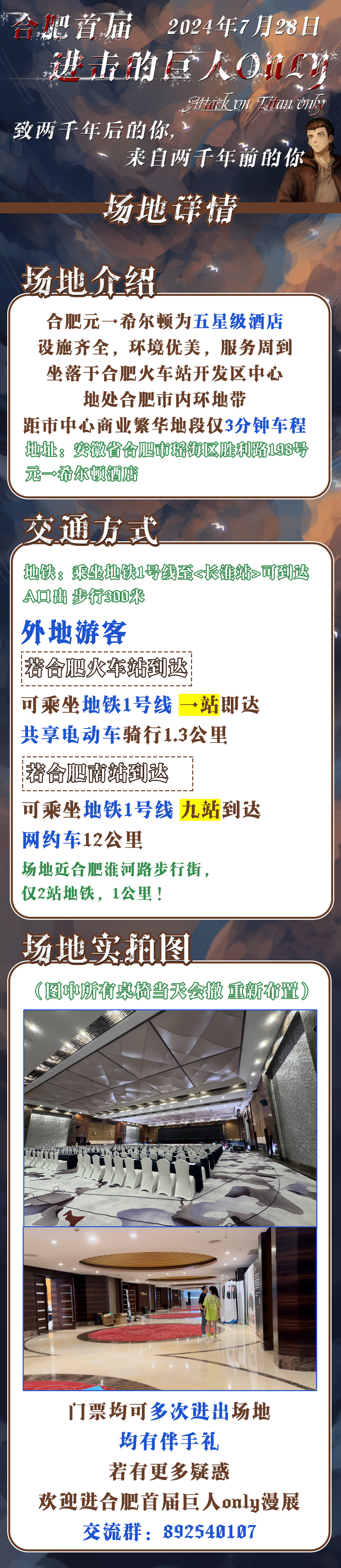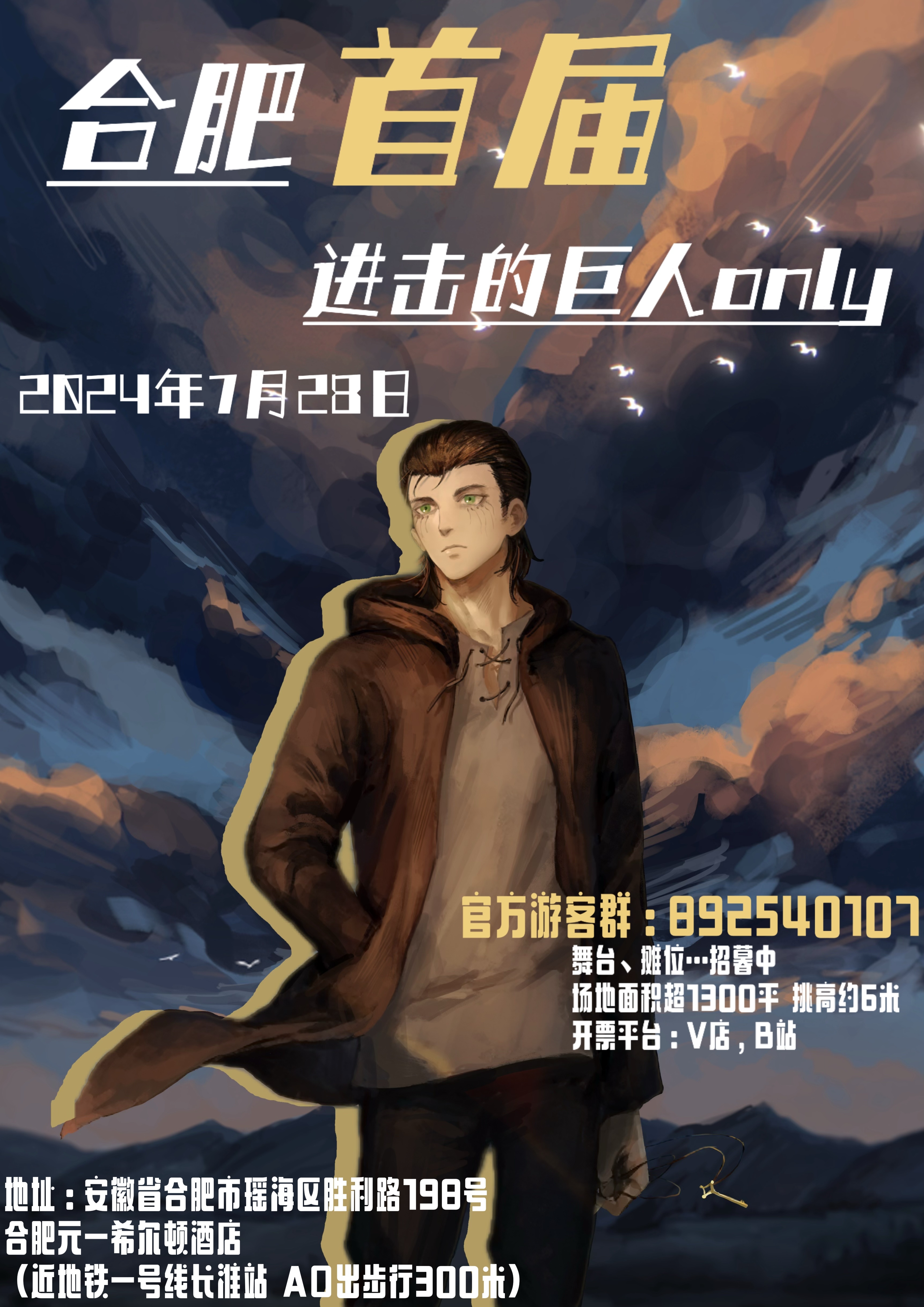 合肥首届进击的巨人only漫展 地址:合肥元一希尔顿酒店 2024年7月28日 我们期待您的到来