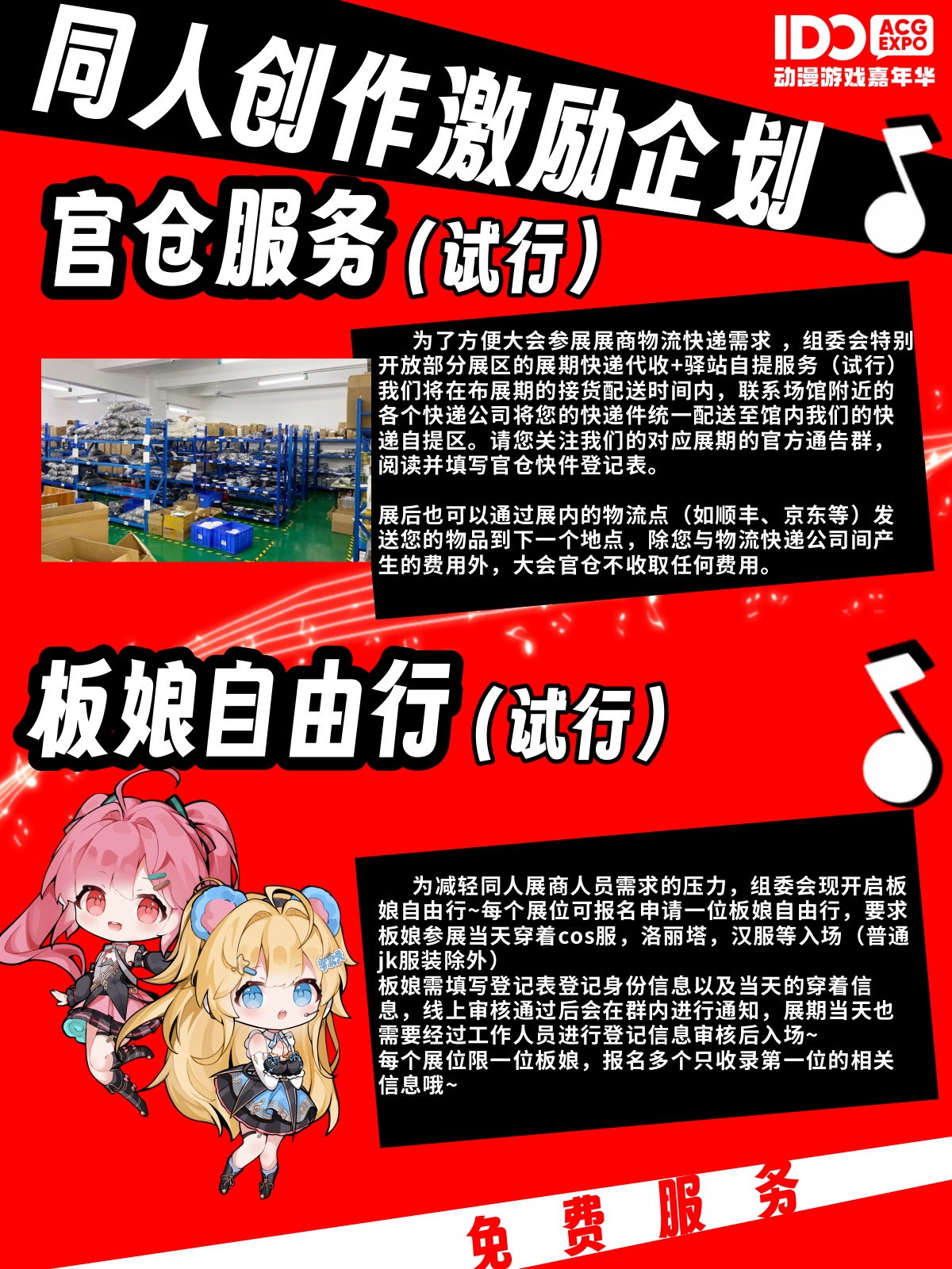 为减轻同人展商人员需求的压力,组委会现开启板娘自由行。每个展位可报名申请一位板娘自由行,要求板娘参展当天穿着cos服,洛丽塔,汉服等入场(普通jk服装除外),板娘需填写登记表登记身份信息以及当天的穿着信息,线上审核通过后会进行通知,展期当天也需要经过工作人员进行登记信息审核后入场~