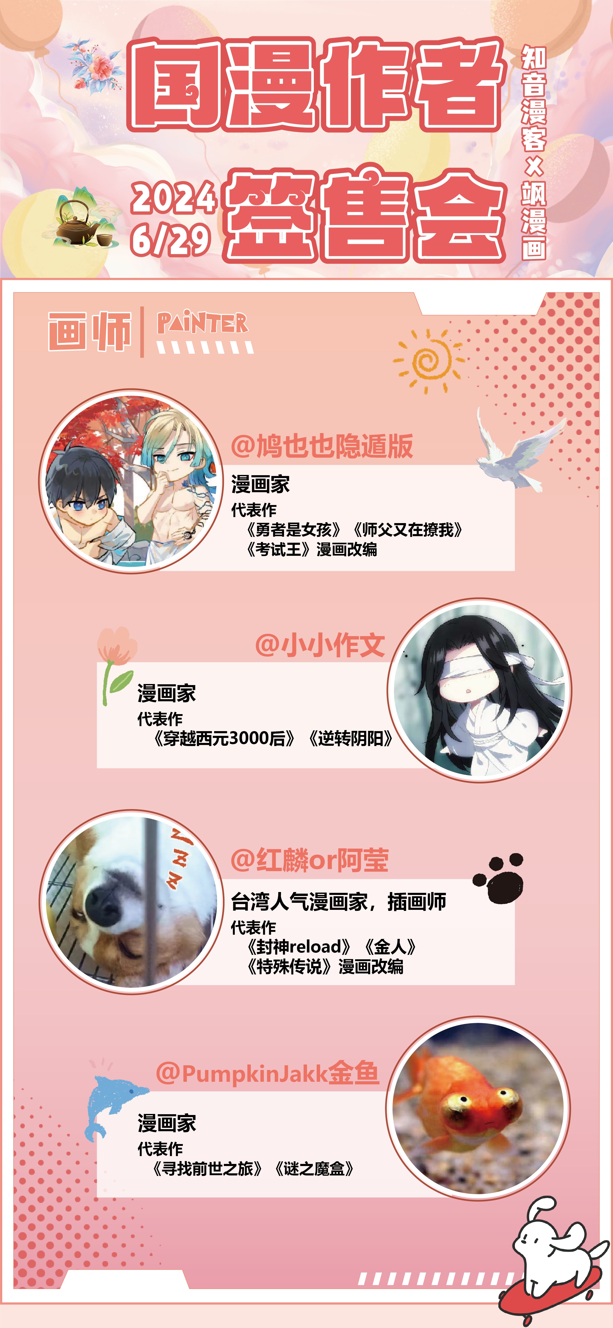 本届茶话会有幸请到了小小作文、金鱼、阿莹、鸠也,四位知名漫画家亲临现场进行签绘,欢迎大家来到本届怀旧漫画茶话会现场,不容错过,就在此刻!与四位老师面对面交流,感受漫画里的那独一份的爱与柔软!