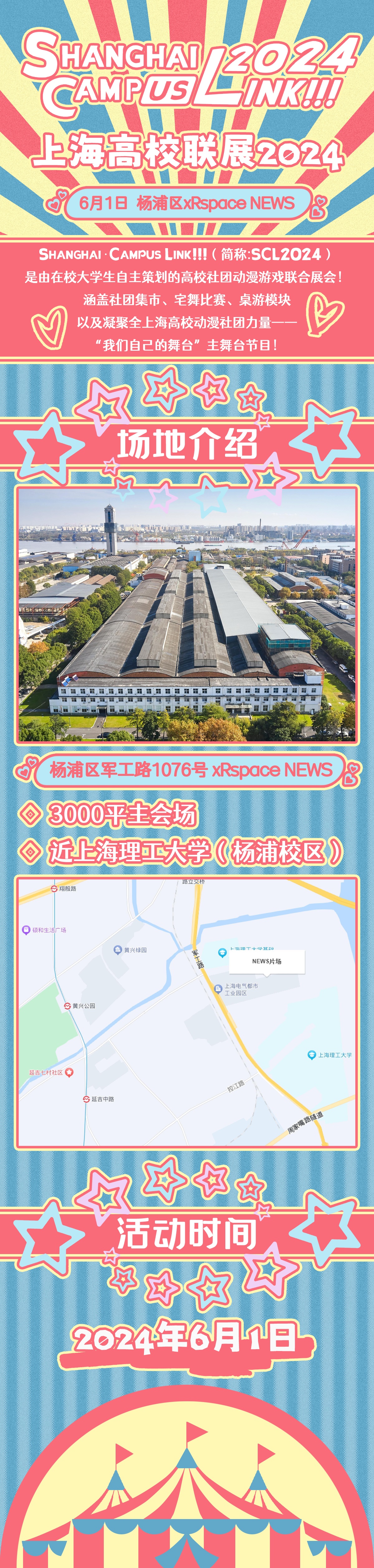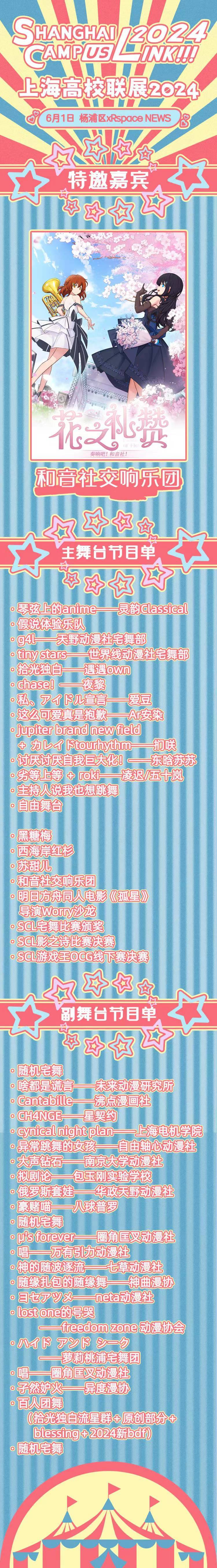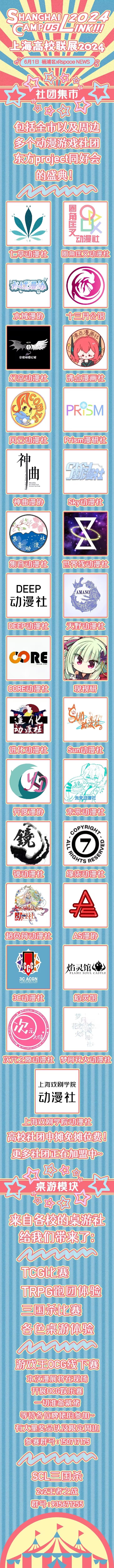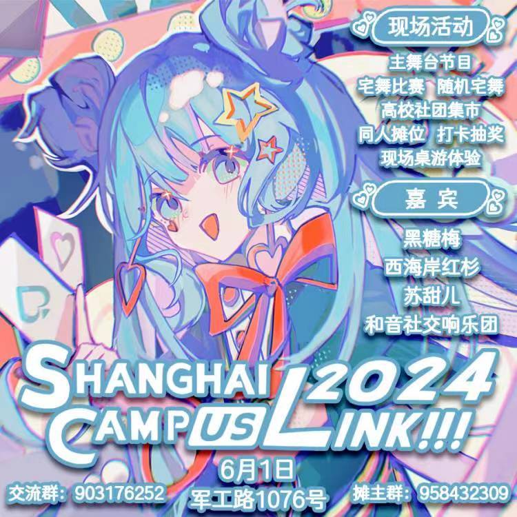 Shanghai·CampusLink!!! 2024(简称:SCL2024),是由在校大学生自主策划的高校社团动漫游戏联合展会,已有超过40个社团及学生组织入驻。包含以下展会模块:社团集市、宅舞比赛、桌游模块、东方project高校联、痛车展示、三坑集市、同人摊位展区以及凝聚全上海高校动漫社团力量——“我们自己的舞台”主舞台节目。