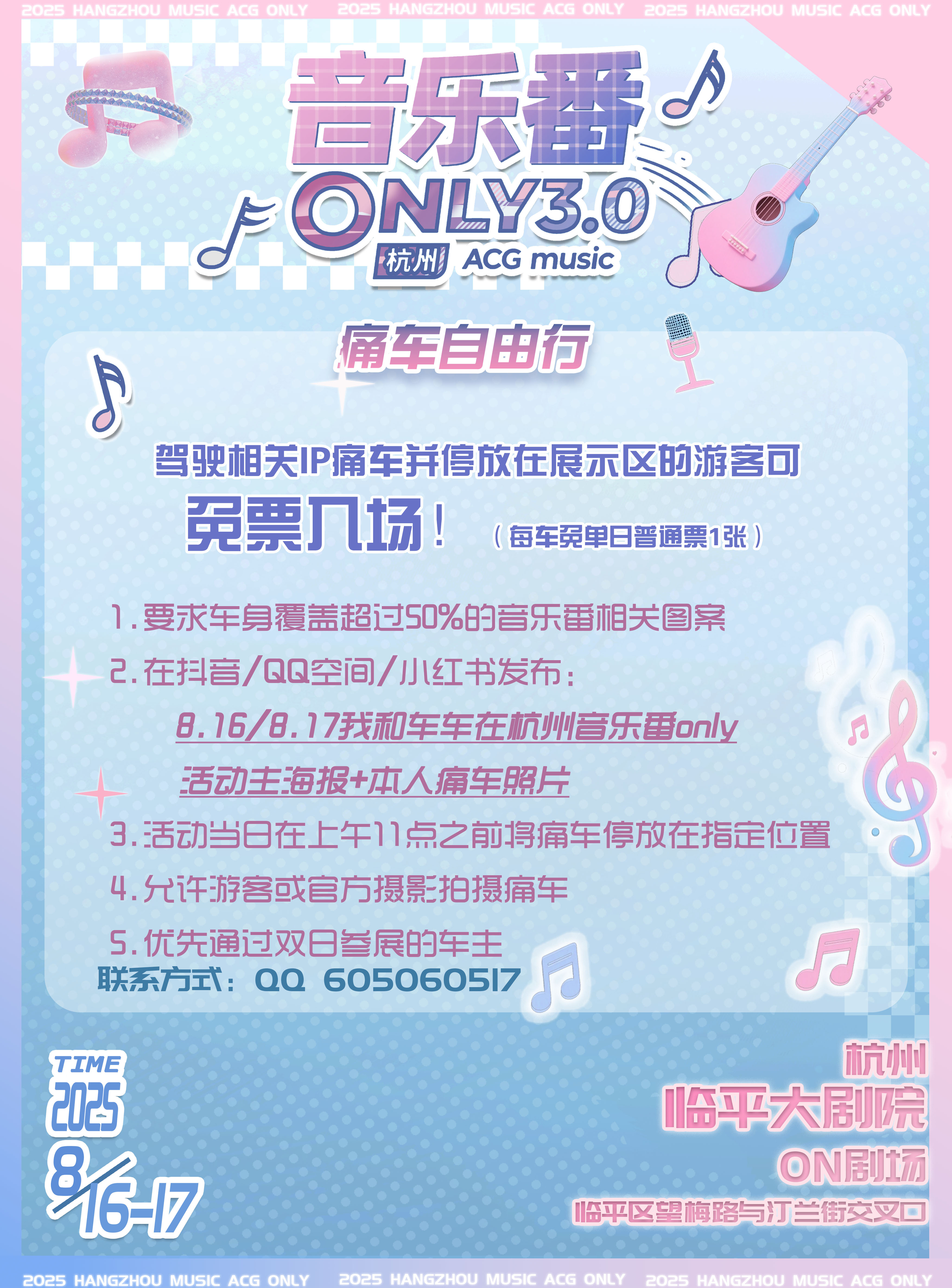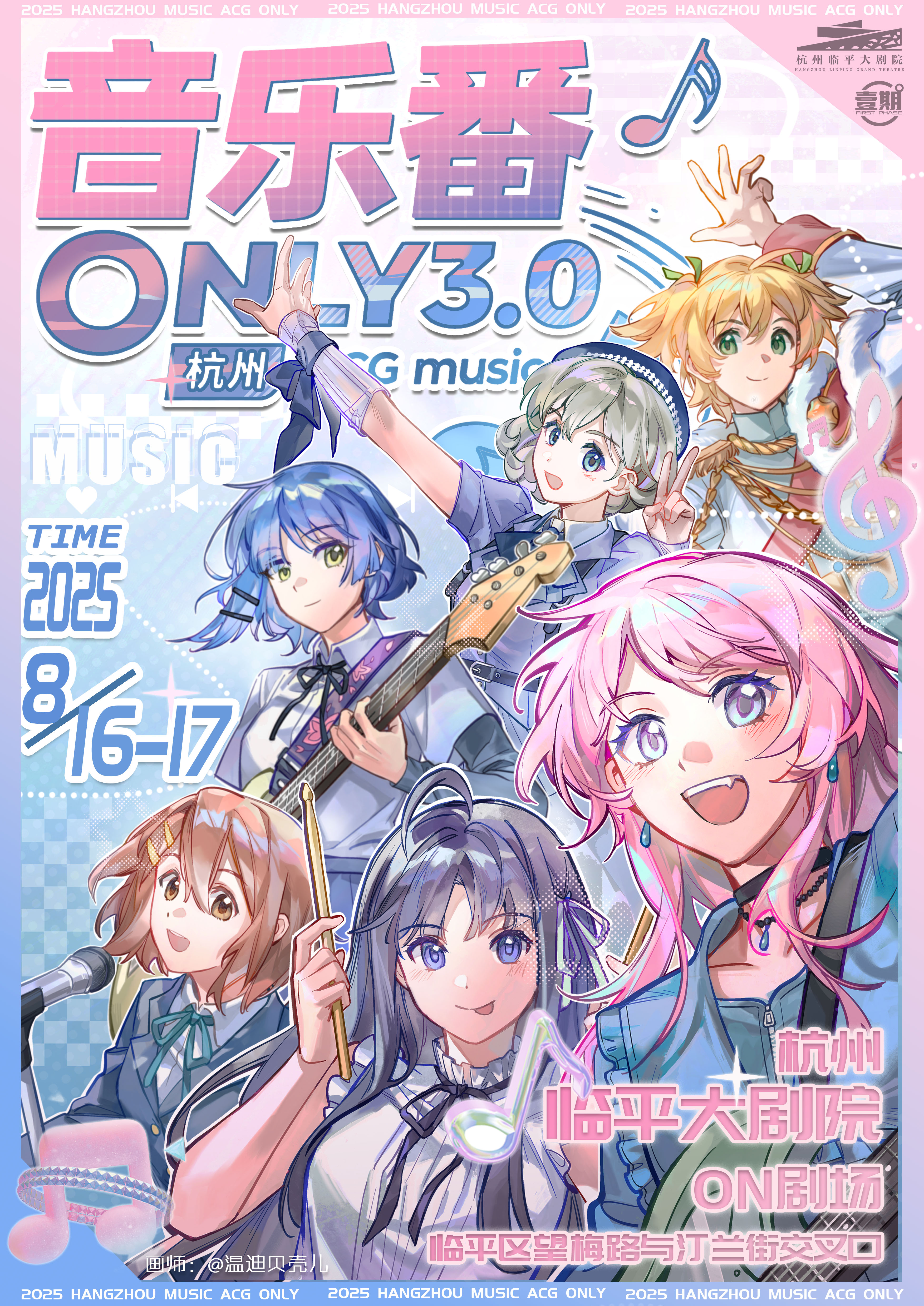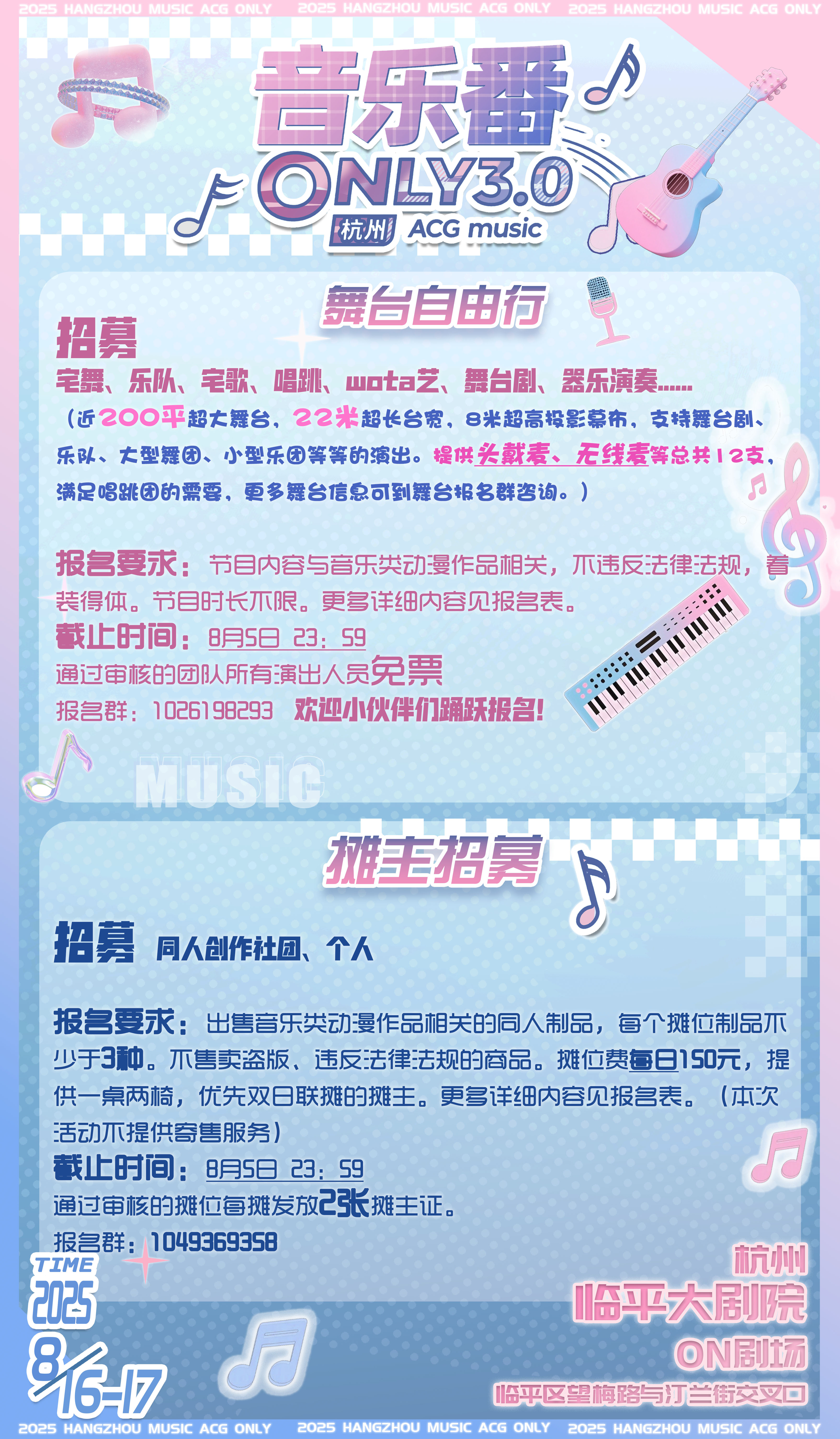 本次音乐番only3.0堂堂登场!超升级!两日全天场来袭! 杭州临平大剧院,室内展区空调全天开放,1000平超大舞台观演区,近200平超大舞台表演区,顶级灯光音响设备。 室外观景天台楼梯+艺尚小镇公园,超4000平总游览区域。 乐队演出、同人舞台剧、自由舞台、地下偶像、同人摊位、互动游戏、嘉宾签售、随机宅舞、自由摄影、音乐番ip痛车展示... 等等后续流程活动逐步解锁。 开票日期:2025年6月20日 购票平台:b站、千岛组局、保利票务 (保利票务为剧场合作,需要在剧院的取票机取票后再以剧院的实体票进入)