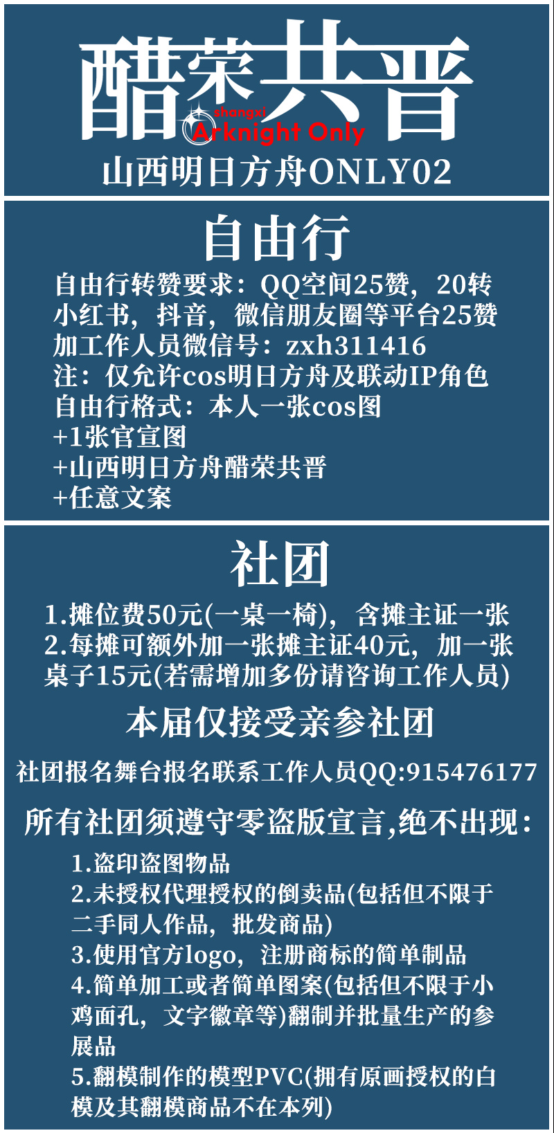 关于 Cosplay :本活动为明日方舟Only 活动,禁止非明日方舟角色的 Coser 入场,联动IP角色可入场