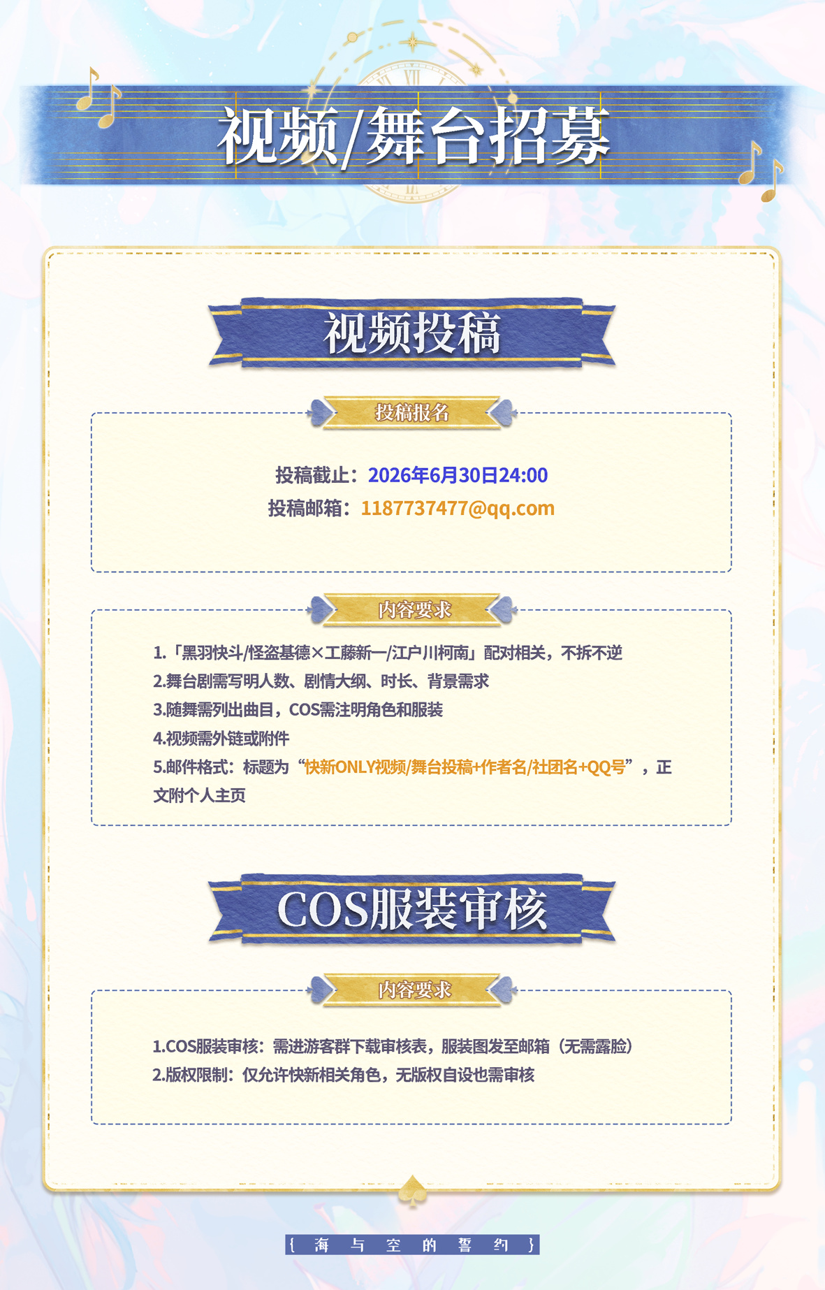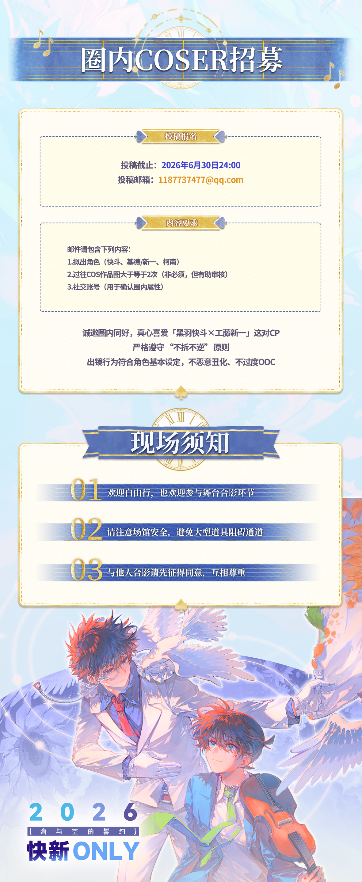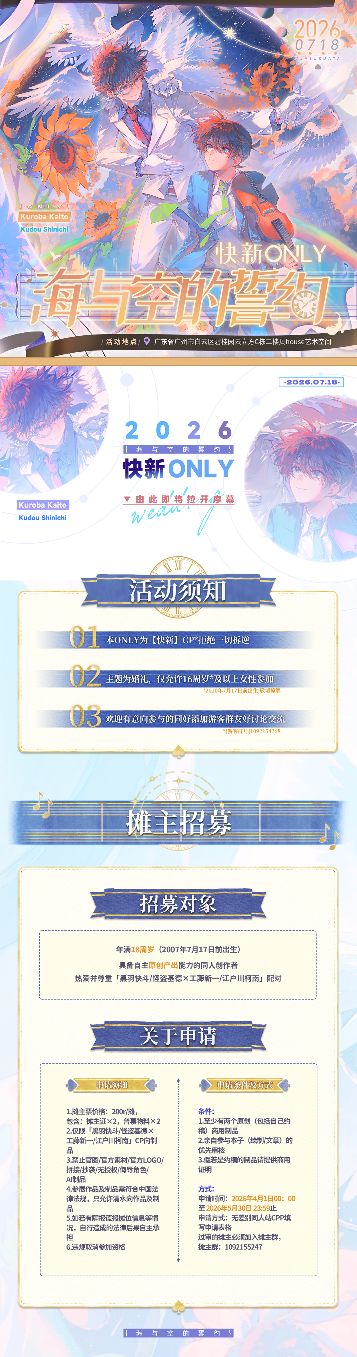 招募对象:年满18周岁(即2007年7月17日之前出生),热爱并尊重「黑羽快斗/怪盗基德×工藤新一/江户川柯南」配对,具备自主原创产出能力的同人创作者。