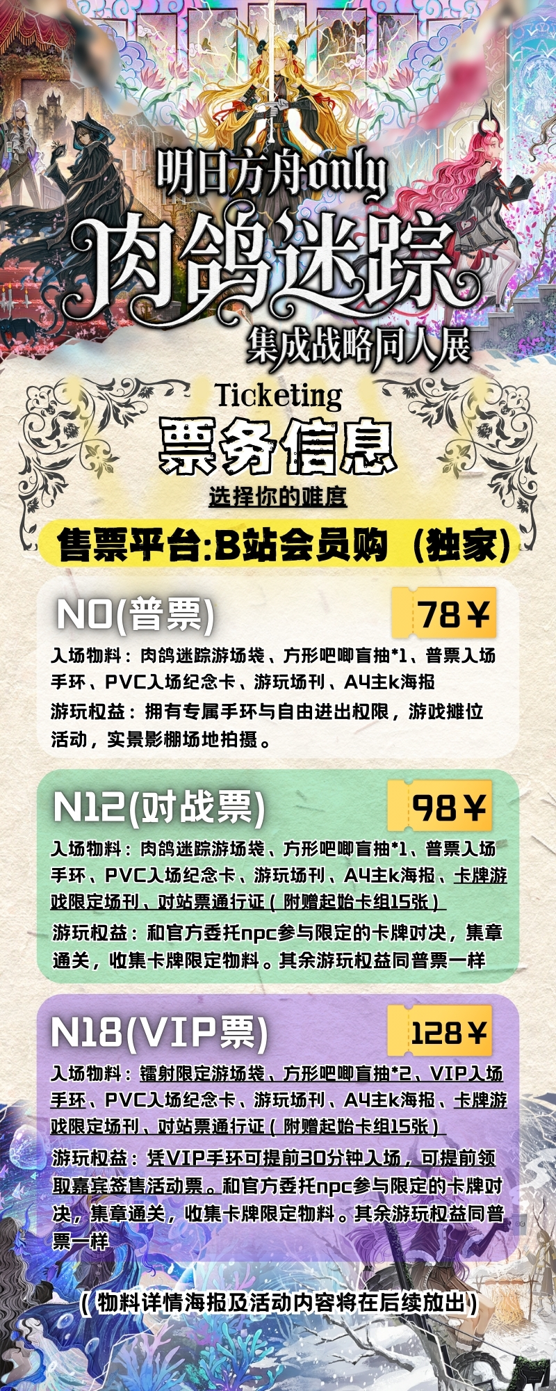 N18(VIP票):128R 普票权益+肉鸽专属物料(赠肉鸽卡牌挑战入场卷)+SVIP物料+舞台座位+VIP小零食+嘉宾互动+快速入场通道(提前半小时入场)