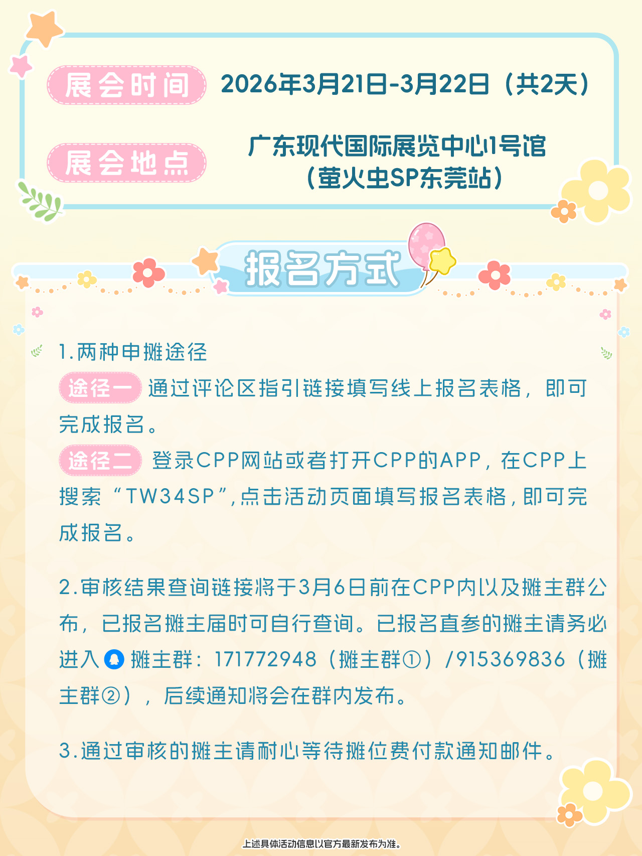 到CPP无差别同人站“TW34SP”活动页面点击【申请摊位】,填写信息并提交。