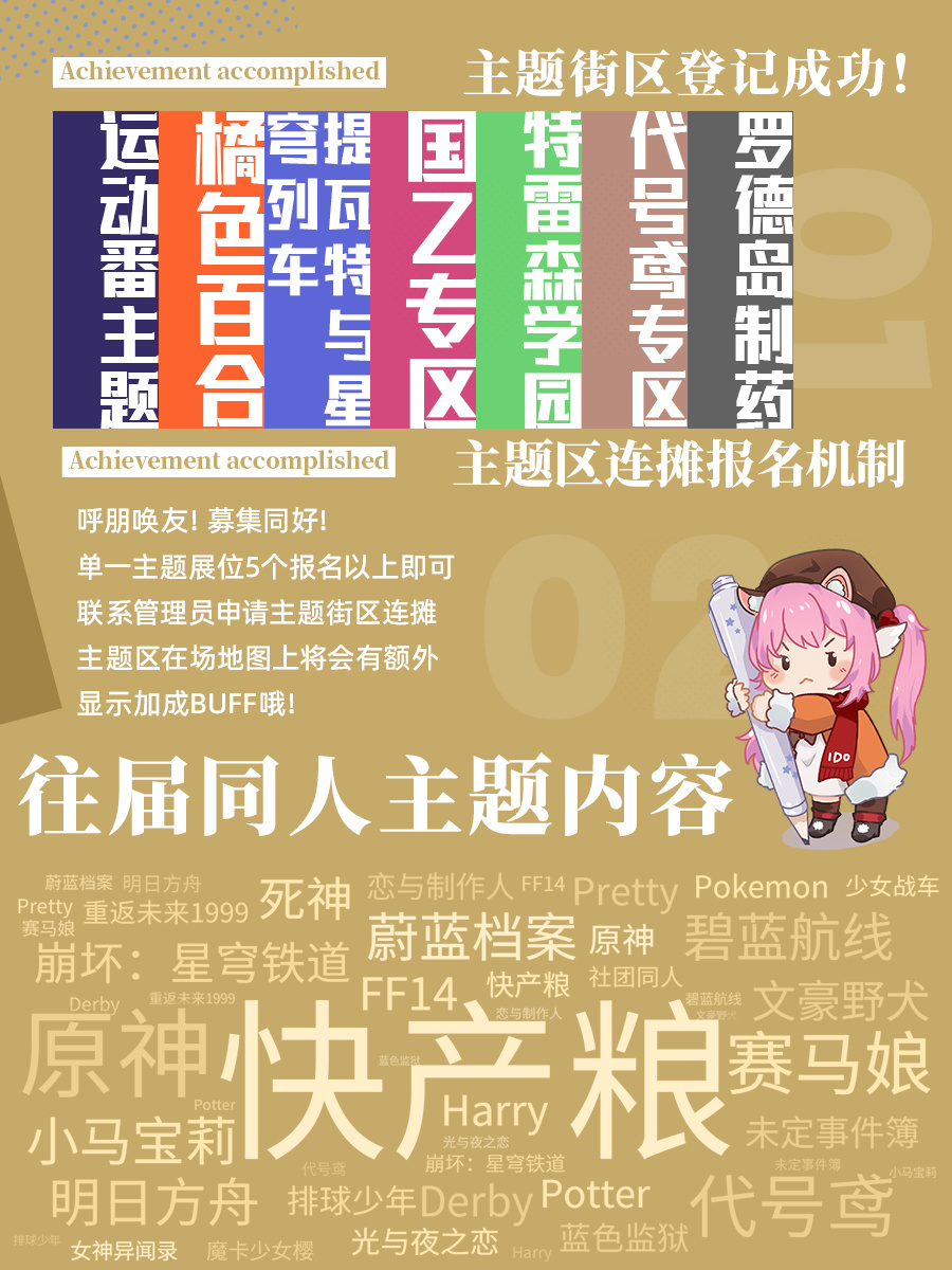 本专区活动指定主题的摊位以原创或同人作品(同人志、音乐、广播剧CD、游戏)作为摊位的主体销售对象