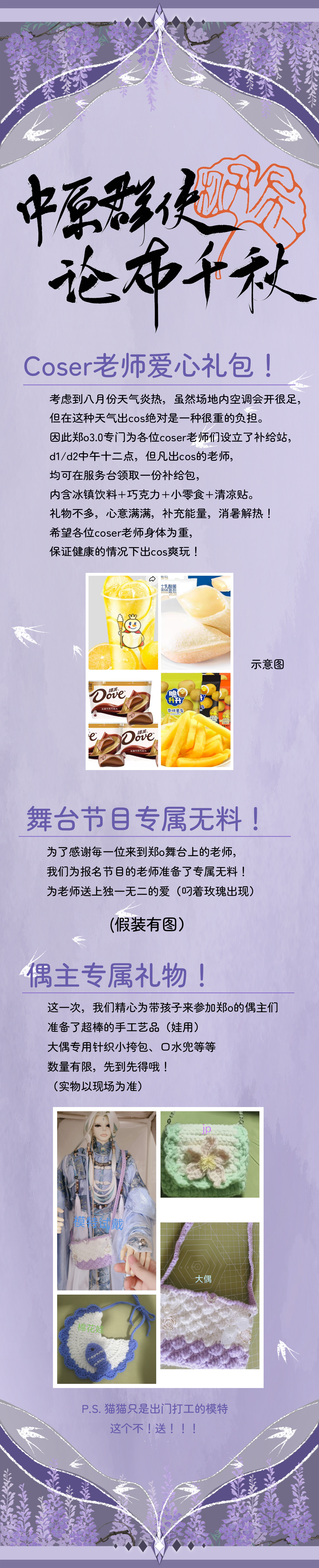 夜场纯送!Oversize摊位!客房加量不加价!还有coser专属补给包!报名舞台节目即可获得专属无料~带娃来到现场更有专属手工艺品赠送哦~