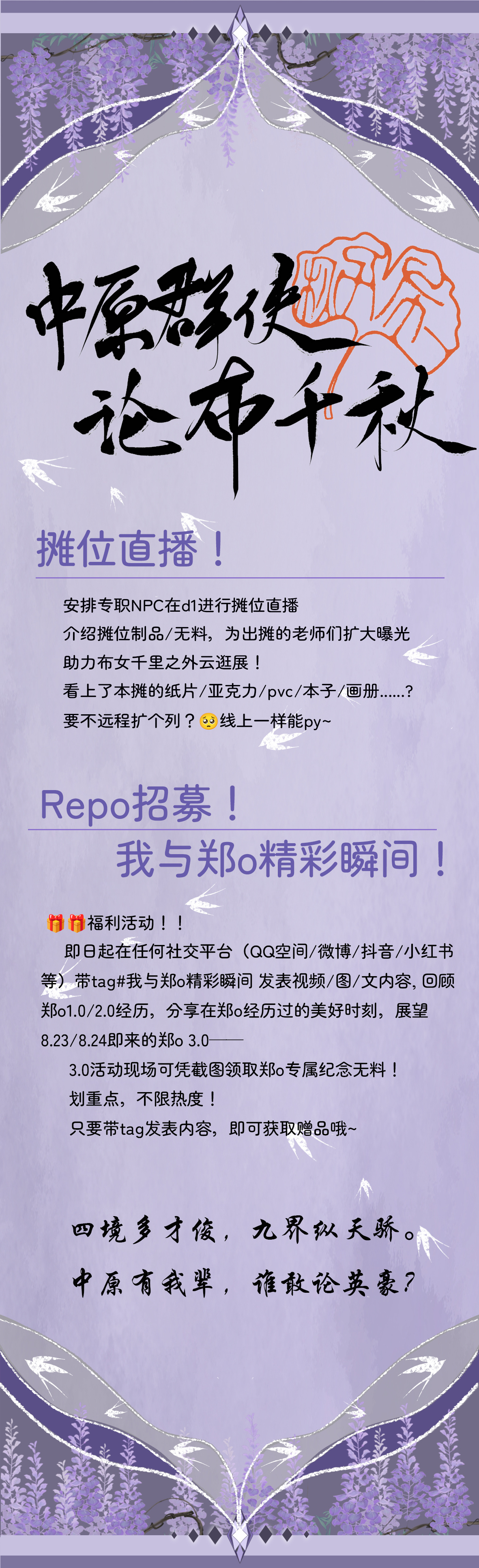 ——Repo活动招募!即日起,在任何社交平台上带tag:我与郑o精彩瞬间 发表图/文/视频,回顾1.0/2.0郑o美好时刻,展望即来的郑o 3.0,活动现场可凭截图领取郑o专属纪念无料!划重点:不限热度哦!只要发了就可以获取~