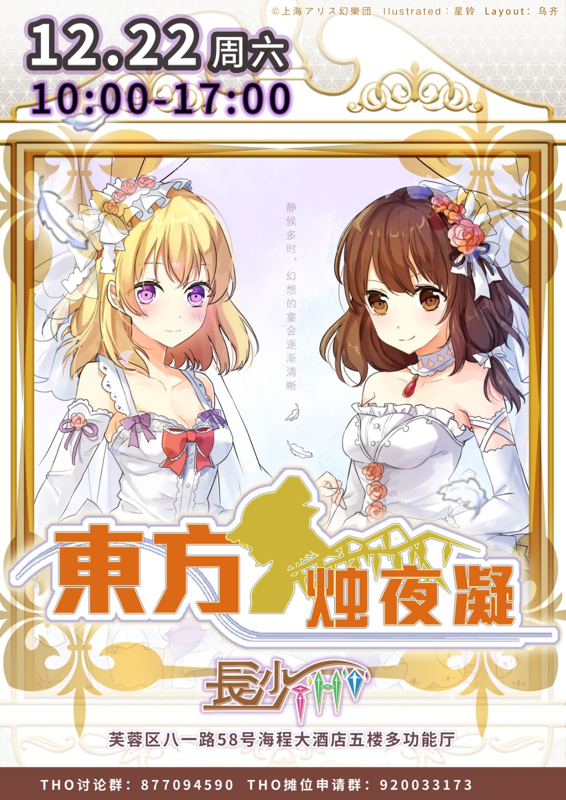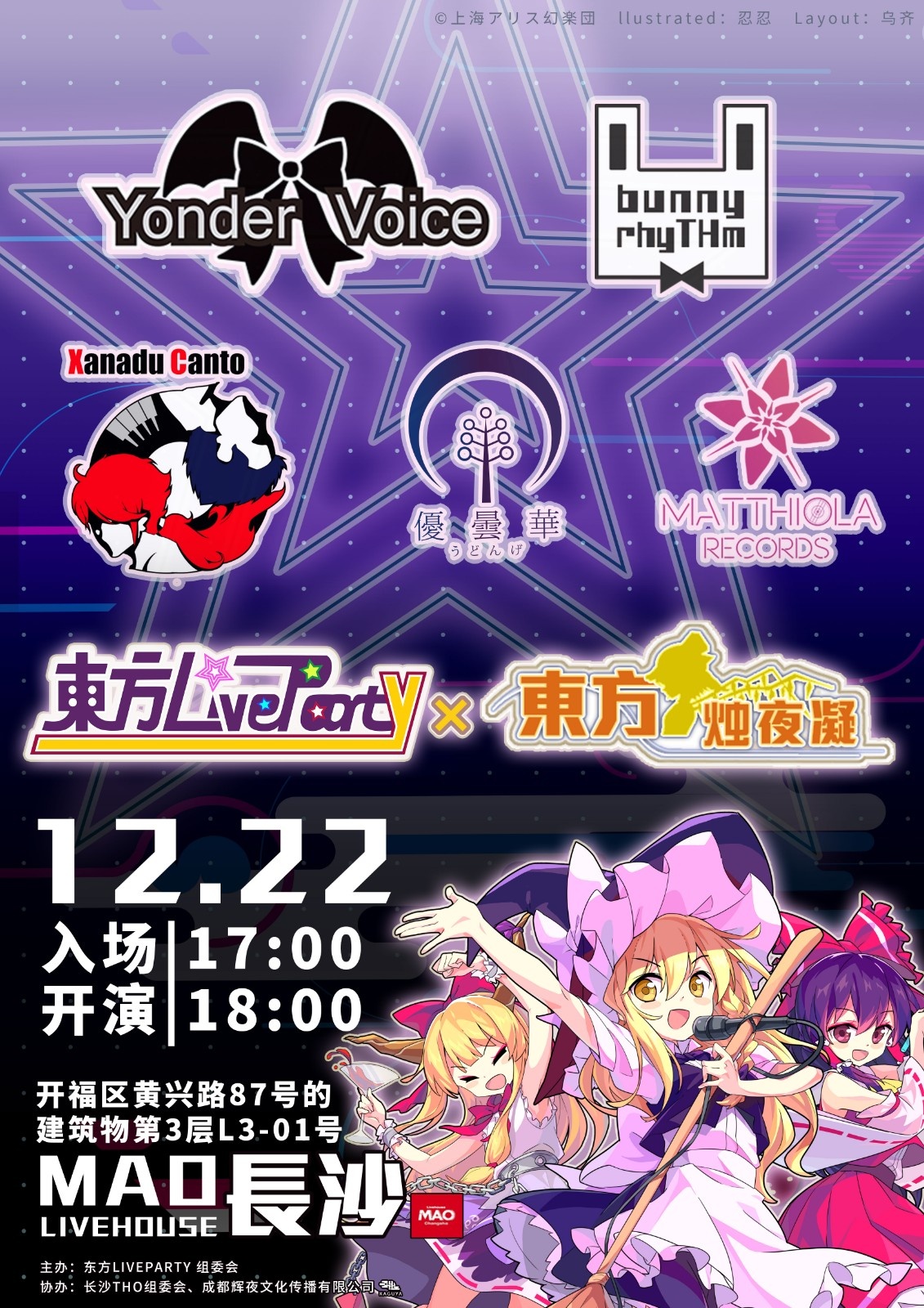 东方LiveParty系列活动,旨在为广大东方同人音乐爱好者们提供最棒最燃的东方同音相关的现场LIVE演出,同时也为国内众多的东方社团搭建一个能直面观众的舞台。为了这个目标,我们继续前进!携手长沙THO——东方烛夜凝,2018年12月22日晚6点,我们将携五支国内一流东方同音社团:bunny rhyTHm、MATTHIOLA RECORDS、YonderVoice、优昙华以及首次以【幻想诗篇 XanaduCanto】名义参与LIVE演出的知名UP主: @核弹阿茶XanaduCanto来到MaoLivehouse长沙与你不见不散。