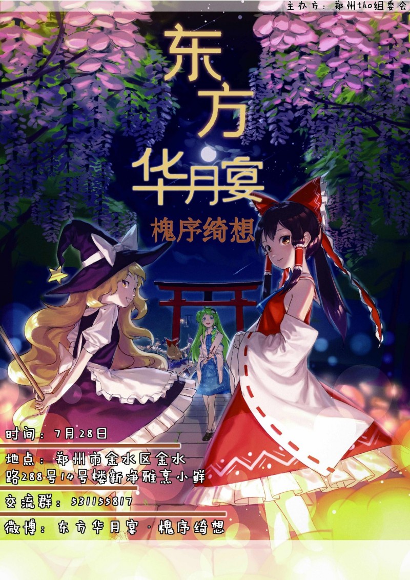 #东方project# #东方华月宴·槐序绮想# #中原TouHouproject Only##一宣# 时隔一年,我们承载着热爱再次回归! 天气转暖,幻想乡也要更加有生机啊 我们定于2018年7月28日,在郑州,一个崭新的幻想乡入口等待你的到来 不需要你多么了解东方project,只要你热爱;不需要你多么熟知东方project,只要你愿意了解,我们都将给予最热切的邀请!
