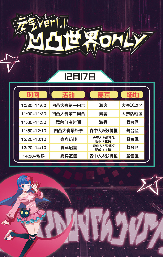 嘉宾最终公布12月16日@NeoDarkshad 和@NAOKI煦 主持人@梁云若,12月17日@-森中人和@张博恒 主持人@卷毛明叔,当初宣传中有说惊喜,就是两天中如果你逮到谁在另一天的现场遛弯儿,那可是你们的本事啦!2333333还要公布个大惊喜就是12月17日有空降嘉宾@默伶丶到场。
