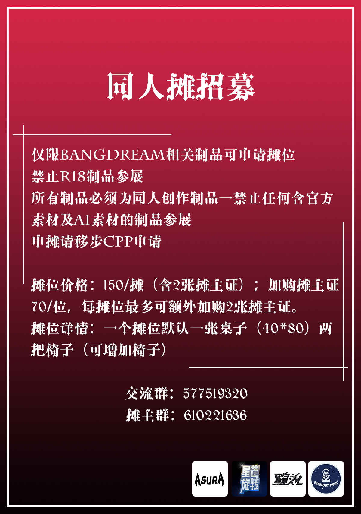 摊位价格:150/摊(含2摊主证);加购摊主证70/位,每摊位最多可额外加购2张摊主证。