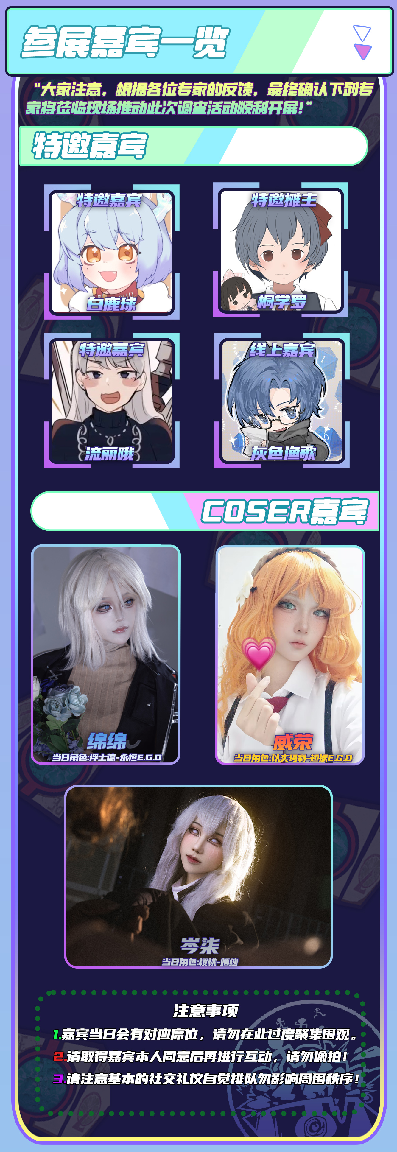 本次漫展拥有移动记录员,官方摄影老师本次担任场记职责,请各位面对我们的摄像头保持微笑,说出你们对支部最真实的想法,后期会对记录内容进行二次编辑并发布在我们的官方账号上~