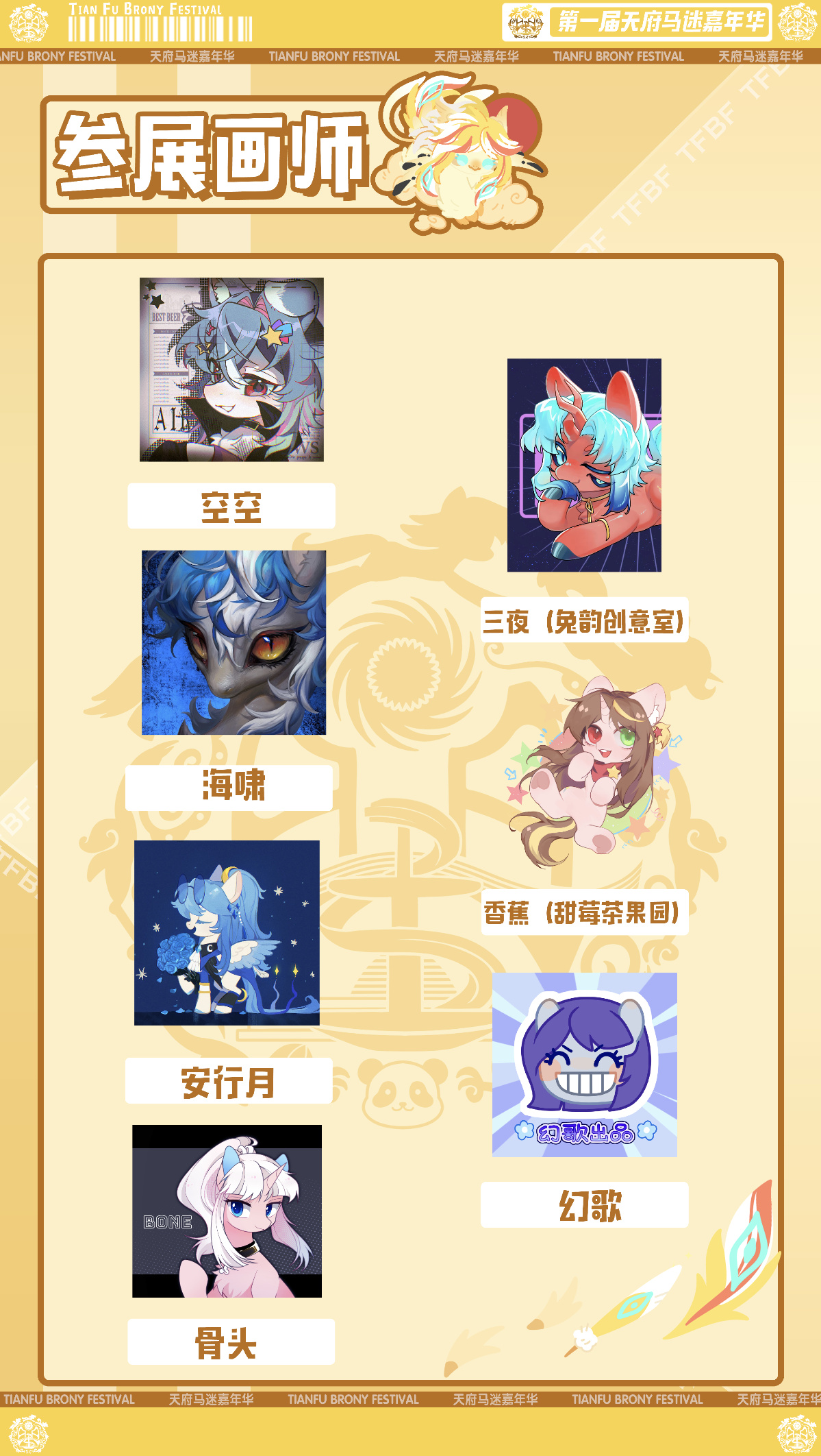Tianfu Brony Festival(TFBF)天府马迷嘉年华是Brony Festival系列马展中西南地区的成都站,第一届将于2025年7月12-13日在成华区雅悦蓝天酒店三楼天合厅举办(成都东站旁),本届两天活动自由+创新+不重复,还会邀请嘉宾来到现场与大家互动签售~超多同人摊位/画师签绘/社团招募等等着大家!官方QQ群:596052460,售票店铺:淘宝兔韵创意室and天御创工,微店兔韵创意室。
