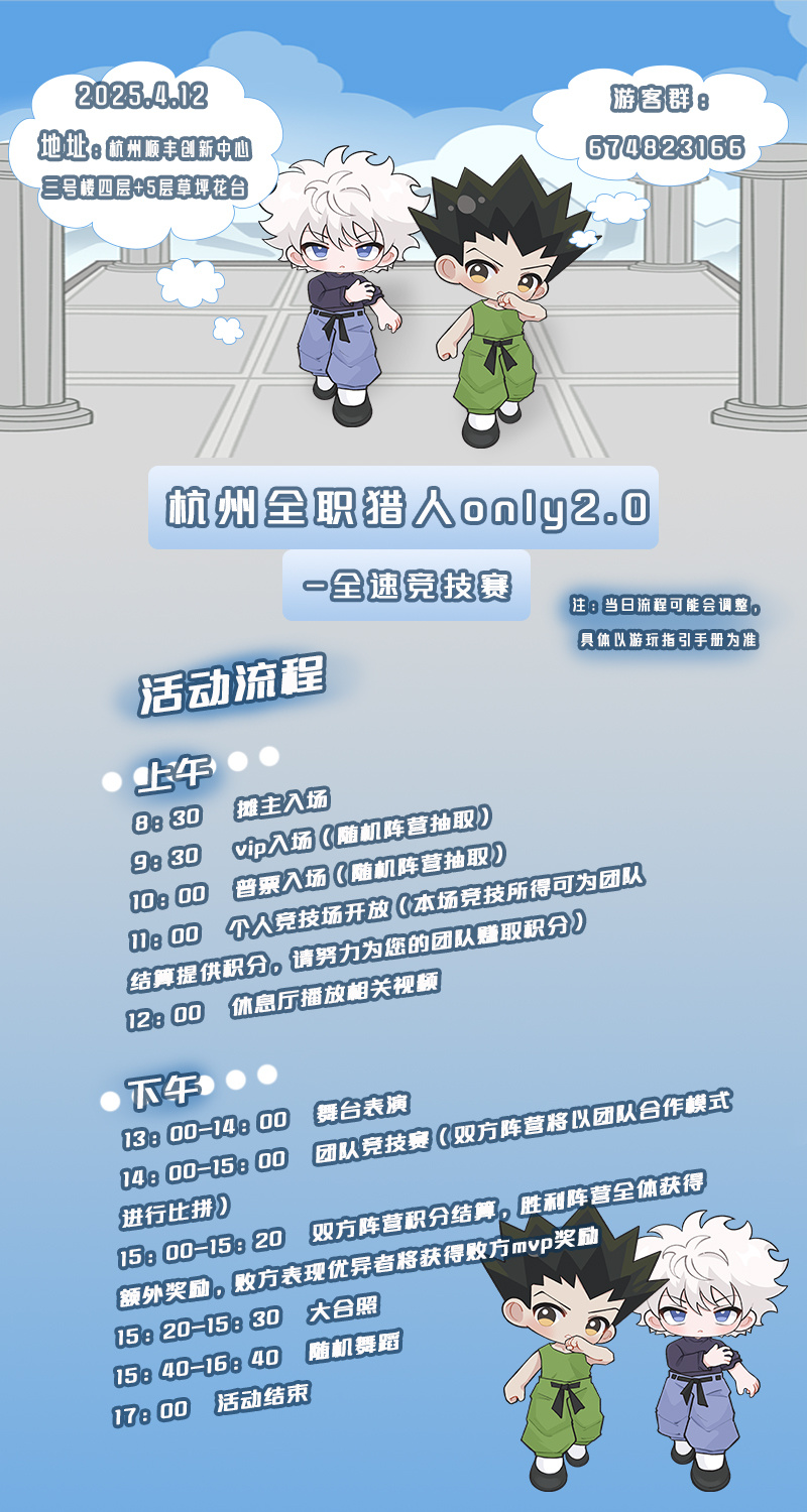 为选出最优秀的猎人团队为本协会所用,我们诚挚邀请各位猎人参与本次竞技活动,当日将以盲抽的方式对各位猎人进行随机分组,本次活动不限于个人与团队合作竞技,请各位参赛猎人们努力为自己所在的团队赚取积分获得最后的胜利(赛程当日我们将给各位猎人发放竞技手册,请各位猎人熟读手册内游戏规则 )